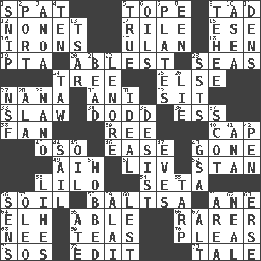 ACROSS 1. Petty quarrel 5. Drink excessively 9. Small amount or degree 12. Music written for nine 14. Cause heat under the collar 15. Compass dir. 16. Removes the wrinkles 17. ____ Bator 18. Layer 19. Parent Teacher Association (abbr.) 20. Most capable 23. Oceans 24. Family _ (genealogy) 25. Otherwise 27. Nanny 30. Cuckoo 32. Be seated 33. Cole _ (cabbage dish) 34. Texas town _ City 36. Double-curved letter 38. Avid follower 39. Portuguese money of account (variant) 40. Head covering 43. Bear (Spanish) 46. Comfort 48. Went 49. Direct toward a target or goal 51. 54 in ancient Rome 52. Comedian Laurel of Laurel & Hardy 53. _ and Stitch 54. Stalk of a moss capsule 56. The visible part of the earth's surface 58. Greek mezzo-soprano Agnes 61. One (Scot) 64. Shade tree 65. Competent 66. Less widely known 68. Born 69. Beverages made from leaves 70. Entreaties 71. Distress signal 72. Prepare for publication 73. Falsehood DOWN 1. Clip 2. Left side of a ship or aircraft 3. Small Philippine buffalo 4. "___ Little Indians" 5. Loyal 6. Petroleums 7. Food holders 8. Car or cant ending 9. Giggle 10. At sea 11. Cub Scout units 13. Russian ruler of old 21. Necklace unit 22. Poe poem 23. Fast planes 24. The 23rd letter of the Hebrew alphabet 26. Falsehood 27. Overdraft (abbr.) 28. Wing 29. Billionth: prefix 31. Perfect 35. Stop 37. Highlander 41. Santa ___, CA 42. Writing instrument 44. Move on water 45. Lubricate 47. Nights before holidays 48. Girls' org. (abbr.) 50. Crowded into 53. Citrus fruits 55. Canvas cover 56. Elected reps. 57. Butter sub 59. Mountain range southwest of Kyrgyzstan 60. For fear that 61. Length times width 62. Actress Patricia 63. Celtic language 65. Had dinner 67. Keyboard modifier key