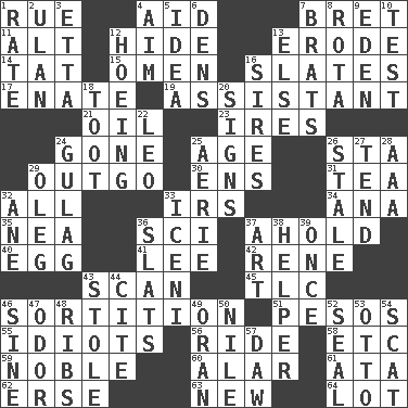 ACROSS 1. Sorrow 4. Assist 7. Cy Young winner Saberhagen 11. The first octave above the treble staff 12. Flintstone garb 13. Eat (away) 14. Make lace 15. Presage 16. Chalkboards 17. Related on the mother's side 19. Helper 21. Lubricate 23. Angers 24. Went 25. Grow older 26. R.R. building 29. Expenditure 30. Followers of ems 31. Afternoon social gathering 32. Everything 33. Big collection agency 34. Santa ___, CA 35. Teachers' org. 36. _-fi 37. Hold, grip (Informal) 40. Oval reproductive body of a fowl 41. Area sheltered from the wind 42. French philosopher Descartes 43. Examine hastily 45. Affectionate concern, for short 46. Conclusion 51. Mexican monetary units 55. Foolish or stupid persons 56. Travel on or in a vehicle 58. And so on (abbr.) 59. Impressive in appearance 60. Having or resembling wings 61. _ moment's notice (2 wds.) 62. Celtic language 63. ___ Haven, CT 64. Car dealer's back yard DOWN 1. Pace 2. ____ Bator 3. Singer James 4. Direct toward a target or goal 5. The main thing one is thinking about 6. Habitations of wild animals 7. Naughty children 8. Roll call or roster of names 9. Locale of original sin 10. Trial 12. Weeding 13. Otherwise 16. Male parents of animals 18. A blast of a horn 20. Attaches a signature 22. Lion 24. Russian prison camp 25. Nest on high 26. Having lost freshness 27. Be inclined (to) 28. Auto club (abbr.) 29. Cassini of fashion 32. One (Scot) 33. Ancient Celtic tribe of eastern Britain 36. Narrow boards 37. Nonscientific branch of learning 38. Aide 39. Single time 43. Took without asking 44. Quote 46. Trig term 47. Aroma 48. Teases 49. Northwest Algerian city 50. "Death on the ____" 52. Lick closed 53. Von Bismarck 54. Go away! 57. Obsolete
