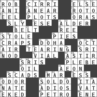 ACROSS 1. Director Reiner 4. High-altitude cloud 9. Otherwise 13. Black tropical American cuckoo 14. Approach 15. Printing process, for short 16. Snakelike fish 17. Graphs 18. Mouths or openings 19. Stealthy 21. Compass dir. 22. Tree or shrub in the Birch family 24. Waist strap 26. To sift 27. Fur scarf 29. Sliced desserts 30. Dice game 31. Capital of the state of Qatar 33. Sep. follower 36. Atmosphere 37. Lacerating 40. Indian title of respect (Mr.) 41. Dreamland 42. Small bottle 43. Having gotten out of bed 45. Indian titles of respect 47. First-year military academy student 48. Petroleum 49. Period of immesurable duration 50. Heaps 52. Impair 54. Curvy letter 56. Scent 57. Twentieth part of a lira 59. Call ___ day 61. Nathan's nickname 62. Goodbye (Sp.) 63. Large container 64. Made supply last 65. Stone: prefix 66. Compass dir. DOWN 1. Actress Charlotte 2. Washington bills 3. Big road sign 4. Head covering 5. An arm off of a larger body of water 6. Vintage cars 7. Assign a rank or rating to 8. Big collection agency 9. Eats (away) 10. Old wives' tales, e.g. 11. Play the lead 12. Greek goddess of the dawn 20. Sharp bark 22. Believer in; advocate of (suffix) 23. Area sheltered from the wind 25. For fear that 27. Examine hastily 28. Musical group of three 29. Silvers or Donahue 31. Raised platform 32. Mouth or opening 33. Clearly or manifestly demonstrative 34. Baby bed with high sides 35. Become fatigued 38. Vices 39. Stare wonderingly 44. _ gin 45. Flew 46. To free from 49. Zeal 50. Neighbor of Neb. 51. ____ d'Azur (French Riviera) 52. Method 53. Came down and settled, as after flight 55. Comedian Laurel of Laurel & Hardy 56. Single 57. Plant excrement 58. Bear (Spanish) 60. Had dinner