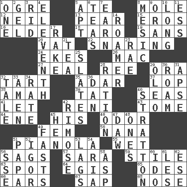 ACROSS 1. Legendary monster 5. Had dinner 8. Undercover agent 12. Famous astronaut Armstrong 13. Lightbulb-shaped fruit 15. Greek god of love 16. A person who is older than you are 18. Pacific island yam 19. Without 20. Large container 22. Catching in a trap 24. Makes supply last 26. Big _ 27. Actress Patricia 28. To riddle 29. Mouth or opening 32. Small pie 35. The sixth month of the Jewish calendar 37. Chop off 38. Wet nurse 39. Make lace 40. Oceans 41. Allow 42. Painter Guido (1575-1642) 43. Heavy book 44. Compass dir. 45. Part of HMS, perhaps 46. Aroma 49. Opposite of masc. 50. Nanny 51. Player piano 55. Soggy 56. Settles 57. "Two Mules for Sister ____" 59. Vertical member of a panel or frame 63. Specific locale 64. The front part of a cuirass 65. Lyric poems 66. Hearing organs 67. Plant excrement 68. Sense of smell DOWN 1. Single 2. Set 3. To free from 4. Veterans Day date 5. Fitting 6. Afternoon social gatherings 7. Merit 8. Of or pertaining to a meson 9. NW Algerian seaport 10. Protracted 11. Double-curved letter 14. Nomad 17. Libertine 21. Beverage made from leaves 23. Actress Charlotte 25. Chalkboards 28. Food allowance for one day 29. Butter sub 30. Wander 31. Domed church section 32. Lie 33. So be it 34. Assign a rank or rating to 36. Daniel's nick name 40. Ski resort town in Vermont 42. Full of chinks, cracks, or crevices 45. Layer 47. Obsolete 48. Washington bills 49. Goes without food and/or water 51. Dad 52. Composer Stravinsky 53. Falls behind 54. Roberta Peters solo 56. Compass dir. 58. Cleo's killer 60. Wedding promise 61. French article 62. Compass dir.