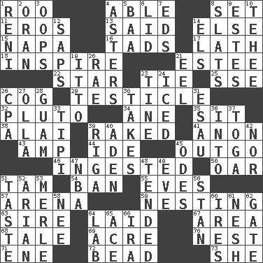 ACROSS 1. Friend of Pooh 4. Competent 8. Arrange properly for use 11. Greek god of love 13. Expressed in words 14. Otherwise 15. California wine valley 16. Small boys 17. Thin strip of wood or metal 18. Motivate 21. First name in cosmetics 22. Play the lead 23. Standoff 25. Compass dir. 26. Gear tooth 29. A testis 32. Greek god of the underworld 34. A saturated hydrocarbon 35. Be seated 38. Jai _ 39. Swept the length of 41. At once, immediately (arch.) 43. Electrical Unit 44. Binary compound 45. Money paid out 46. Eaten 50. Boat paddle 51. Scottish cap 54. Prohibit 55. Nights before holidays 57. Sports stadium 59. Snuggling 63. Male parent of an animal 64. Put down 67. Length times width 68. Story 69. 43,560 square feet 70. A home for chicks 71. Compass dir. 72. Necklace unit 73. A female animal or person DOWN 1. Painter Guido (1575-1642) 2. Northwest Algerian city 3. I made a mistake 4. Michaelmas daisies 5. Sound made by sheep 6. Flaplike covering 7. Begley and Asner 8. Narrow boards 9. _____ Park, CO 10. Giggle 12. Plant excrements 14. Raised railways 19. "Tell ____ the Marines!" 20. Actress Charlotte 21. Snakelike fish 23. Prong on a fork 24. On the rocks 26. Numbers guy (abbr.) 27. Spanish pot 28. Island territory of the United States 30. Proceeds 31. Son of Isaac 33. Native american tent (variation) 36. To the inside or interior of 37. Ancient Roman robe 39. Capital of Latvia 40. An important port of Yemen 42. Not either 45. Lyric poems 47. Basketball assoc. 48. Looked after 49. Night before a holiday 51. Clothes sense 52. Believer in; advocate of (suffix) 53. Haggard of country music 56. Comedian Laurel of Laurel & Hardy 58. Born 60. Angers 61. Delicate 62. Yard entry 64. Experiment locale 65. Adept person 66. Lyricist Gershwin