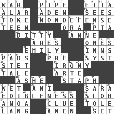 ACROSS 1. Armed conflict 4. Corncob 8. Singer James 12. Having or resembling wings 14. Arabian gulf 15. Perceives with the eye 16. Puff or smoke 17. Unrelated to defense, as in spending 20. Adolescent 21. Mouth or opening 22. Parent Teacher Assoc. 23. Short, simple song 27. Queen of England 1702-14 29. Ancient Greek god of war 31. Singles 34. Poet Dickinson 35. Taverns 36. Groovy apts. 39. Before (prefix) 41. System (abbr.) 42. Proofreading order 43. Literary sarcasm 46. Story 47. Johnson of "Laugh-In" 48. American tennis player Robert 51. Staphylococcus 54. Dripping 56. Black tropical American cuckoo 58. "Two Mules for Sister ____" 61. The property of being fit to eat 66. Oscar Madison type 67. Small Philippine buffalo 68. A slight indication 69. Lacquered or enameled metalware 70. Long (Scottish) 71. So be it 72. Put into a specified state DOWN 1. Electrical Unit 2. _ vera 3. Swept the length of 4. Baking dish 5. Wedding promise 6. Writing instrument 7. Inside; within (prefix) 8. Compass dir. 9. 3-inch nail 10. Trial 11. Toward the sea 13. Painter Guido (1575-1642) 18. Epoch 19. Air blower 24. Scottish cap 25. Three (prefix) 26. Sharp bark 28. Annoyingly loud 30. Damascus' land 32. Followers of ems 33. Fast jet (abbr.) 34. _____ Park, CO 36. Pacific Standard Time (abbr.) 37. "One Day ___ Time" 38. Conveyance 40. Blunders 44. Baseball player Mel 45. Teachers' org. 49. Actor Linden 50. Compass dir. 52. Inconspicuous attention getter 53. Radiant circles of light 54. Welt 55. Pulitzer Prize-winning author Ferber 57. South American Indian 59. Hero or heavy, e.g. 60. Collude with 62. Paper or plastic container 63. Shade tree 64. Take to court 65. Elected rep.