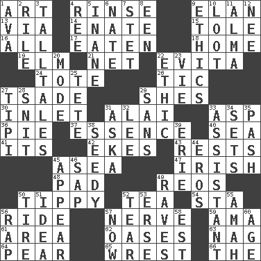 ACROSS 1. Nonscientific branch of learning 4. Wash lightly 9. Style 13. By way of 14. Maternal 15. Lacquered or enameled metalware 16. 100% 17. Ingested 18. Dwelling 19. Shade tree 21. Remaining after all deductions 22. Webber/Rice musical 24. Carry 26. Nervous spasm 27. Sadhe (variant) 29. "______ My Girl" (Turtles hit) 30. An arm off of a larger body of water 31. Mountain range southwest of Kyrgyzstan 33. Cleo's killer 36. Sliced dessert 37. Center 40. Ocean 41. ___ a Wonderful Life 42. Supplements with great effort 43. Musical pauses 45. At sea 47. From or relating to Ireland 48. Groovy apt. 49. Vintage cars 50. Likely to tip or tilt 52. Afternoon social gathering 54. R.R. building 56. Travel on or in a vehicle 57. Boldness 59. Nursemaid (var.) 61. Type of rug 62. Fertile tracts in a desert 63. Tired old horse 64. Lightbulb-shaped fruit 65. Obtain by seizing forcibly or violently 66. Definite Article DOWN 1. Actress Gardner 2. Cause heat under the collar 3. Baron Munchausen's specialties 4. To riddle 5. Silly 6. Nathan's nickname 7. Proofreading order 8. Car or cant ending 9. Moral principles 10. Plunder 11. _ mater 12. Born 20. Method 22. Moral principle 23. Compete 25. Wig 27. Native american tent (variation) 28. In a ____ (agitated or irritated) 29. Without 31. "____ silly question..." 32. Area sheltered from the wind 33. Helper 34. Arranges properly for use 35. Romantic infatuation 38. Full of seeds 39. One of the Great Lakes 44. Greek god of love 45. Seem 46. Plant excrement 49. All-night dance parties 50. Hoop that covers a wheel 51. The content of cognition 52. Pull into pieces 53. Celtic language 55. Housemaid 56. Hit sharply and swiftly 57. At this time 58. Eastern Standard Time (abbr.) 60. Grow older