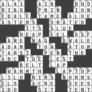 ACROSS 1. Jai ____ 5. Atmosphere 8. 17th letter of the Greek alphabet 11. Chest bones 12. Demure 14. Electrically charged atom 15. Peak District village in England 17. Not wild 18. Medicinal plant 19. Michaelmas daisies 21. Spoke pompously 23. ___ a Wonderful Life 25. Change direction abruptly 26. Pile 27. Snakelike fish 28. Order of Saint Francis (abbr.) 31. One (Scot) 33. Tired old horse 35. A sleeping potion; an opiate (poet.) 37. First of billions? 38. Pull behind 40. Tiny particle 41. Tarsus (plural) 43. Animal enclosure 45. Definite Article 46. Curve 47. Third day of the wk. 50. For fear that 52. Waist strap 53. Infant locale 54. Heat 56. Portable computer 61. _ and Stitch 62. Basketball hoops 65. Typical standards 66. Raised railways 67. 43,560 square feet 68. Perceives with the eye 69. Wedding promise 70. Be seated 71. Portable shelter DOWN 1. Length times width 2. Flaplike coverings 3. Blind as ____ 4. Capri or Wight 5. Fitting 6. Lyricist Gershwin 7. Full of chinks, cracks, or crevices 8. Cause heat under the collar 9. Parka part 10. Single 13. Haggard of country music 16. 4th largest of the Great Lakes 18. Had dinner 20. Comedian Laurel of Laurel & Hardy 22. Old (Scot.) 24. Argument over a trivial matter 26. Is hesitant and indecisive 28. Pledge 29. _ gin 30. Opposite of masc. 31. The sixth month of the Jewish calendar 32. Drug cop 34. Grand Old Party 36. Electrical Unit 37. "One Day ___ Time" 39. Not ill 42. Detail 44. Actress Patricia 48. Extremist 49. Principles of right and wrong 51. Connect, as a bridge 52. Sis' sibling 54. Uncontrolled 55. In addition 57. Mail 58. Relationship diagram 59. Sign of things to come 60. Inconspicuous attention getter 61. Flowery wreath 63. Medical imaging device (abbr.) 64. Arrange properly for use