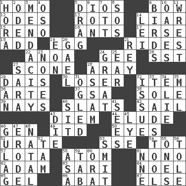ACROSS 1. Same (prefix) 5. "Vaya con ____" 9. Arrow shooter 12. Lyric poems 13. Printing process, for short 14. One who doesn't tell the truth 15. Former U.S. Attorney General Janet 16. Pismires 17. Celtic language 18. Increase 19. Oval reproductive body of a fowl 21. Amusement-park features 22. Small Philippine buffalo 24. Unit of force equal to gravity 26. Fast jet (abbr.) 27. Biscuitlike quick bread 28. Like ___ of sunshine 29. Raised platform 30. Failure 32. Detail 36. Johnson of "Laugh-In" 37. Girls' org. (abbr.) 38. Flatfish 39. Negative votes 40. Narrow boards 42. Travel by water 43. South Vietnam president (1954) 44. Evade 46. Commissioned military rank (abbr.) 49. It would 50. Sight organs 51. A salt of uric acid 53. Compass dir. 54. Small child 57. Globular water bottle used in Asia 58. Smallest unit of an element 61. Words to Nanette 62. First of billions? 63. Indian skirt 64. Christmas carol 65. Set 66. Blind as ____ 67. Otherwise DOWN 1. Israeli folk dance 2. Wrote a lyric poem 3. Ananias' fault 4. Bear (Spanish) 5. To be drawn or hauled along 6. Electrically charged atom 7. Baseball player Mel 8. Mayday 9. Avian creatures 10. Fertile tracts in a desert 11. Take or capture by force 14. Flowery wreath 19. A really long time 20. Highlander 21. Marina Del _, California 23. Olfactory organs 24. Relatively large 25. Hearing organ 27. "Two Mules for Sister ____" 28. Indian state 29. Daniel's nick name 31. Stared at amorously 32. Come out of 33. Inedible or poisonous agaric 34. Writer Wiesel 35. Cartoonist voice _ Blanc 40. Be seated 41. Perceives with the eye 43. Pass on 45. Potassium hydroxide 46. POW camp 47. Eat (away) 48. Relating to or accompanying birth 52. Scottish cap 53. Stricken, poetically 55. Singles 56. Lacquered or enameled metalware 58. White ___ sheet 59. Keyboard key 60. Mouth or opening 61. Compass dir.