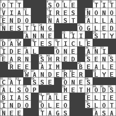 ACROSS 1. Baseball player Mel 4. Flatfish 8. Teat (slang) 11. Small bottle 13. Angers 14. Words to Nanette 15. Inside; within (prefix) 16. Political cartoonist Thomas 17. Silent film actress Nazimova 18. Snuggling 21. Stared at amorously 22. Singer Murray 23. Cards in a Roman deck? 25. Filthy place 26. Obsolete 29. One of the two male reproductive glands 32. Standard of perfection 34. Single 35. Cuckoo 38. Merit 39. Fragment 41. Elected reps. 43. To separate or throw off 44. Direct toward a target or goal 45. Memphis, Tenn. Street 46. Roamer 50. Potassium hydroxide 51. Feline 54. Compass dir. 55. Singles 57. Columnist Joseph or Stewart 59. Modes 63. Prejudice 64. Story 67. Writer Wiesel 68. Southeast Asian peninsula 69. Butter sub 70. Notch 71. Born 72. Labels 73. White ___ sheet DOWN 1. Baking chamber 2. Prong on a fork 3. Bits 4. Burns superficially 5. Mouth or opening 6. French article 7. Eastern Standard Time (abbr.) 8. For Whom the Bell _____ 9. An arm off of a larger body of water 10. Sycophant 12. Globular water bottle used in Asia 14. Tired old horse 19. International (abbr.) 20. Compass dir. 21. Petroleum 23. Actor's bit 24. On the rocks 26. Pass on 27. The sixth month of the Jewish calendar 28. We are 30. Singer Mel 31. Relaxation 33. Afresh 36. Anneal 37. Inwardly 39. Without 40. Flintstone garb 42. Perceive with the eye 45. Cy Young winner Saberhagen 47. Viper 48. Lover boys 49. Compass dir. 51. Apartment or room in a ship 52. Place in a line 53. Sadhe (variant) 56. "______ My Girl" (Turtles hit) 58. Bear (Spanish) 60. Spanish pot 61. "Vaya con ____" 62. Bristle 64. Small child 65. Wing 66. Part of a journey