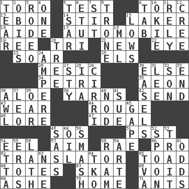 ACROSS 1. "Corrida" creature 5. Trial 9. Torque (variant) 13. Inky black, to poets 14. Use a spoon 15. Member of a famous L.A. basketball team 16. Helper 17. Car 19. Portuguese money of account (variant) 20. Three (prefix) 21. ___ Haven, CT 22. Sight organ 23. Fly high 25. Raised railways 26. Mesonic 30. Otherwise 34. _ dish (used to culture cells) 35. Period of immesurable duration 36. _ vera 39. Tall tales 42. Post 43. Erode 44. Makeup applied to the cheeks 46. Old wives' tales, e.g. 47. Standard of perfection 48. Mayday 51. Inconspicuous attention getter 54. Snakelike fish 57. Direct toward a target or goal 58. Actress Charlotte 60. Adept person 62. Interpreter 65. Frog relative 66. Lugs 67. Three-handed card game 68. Nothingness 69. American tennis player Robert 70. Dwelling 71. Pismires DOWN 1. Pull into pieces 2. Off-Broadway awards 3. Cowboy competition 4. Single 5. Russian ruler of old 6. Needle holder 7. Be seated 8. Marketplace scale 9. Keyboard key 10. Migrant worker of the '30s 11. Depend 12. Algonquian 15. Coldest temperatures 18. Cartoonist voice _ Blanc 20. Relationship diagram 24. Electrical Unit 27. Filthy place 28. Lyricist Gershwin 29. High-altitude cloud 30. Artist's stands 31. Area sheltered from the wind 32. Manchild 33. Conclude 36. Leather borer 37. Lion 38. Rowing implement 40. Allow head to fall sleepily 41. Take to court 45. Open wide 48. Backtalk 49. Lubricate 50. Box-office sellout 52. Soup utensil 53. Distinguishing feature 54. Singer James 55. Greek god of love 56. Thin strip of wood or metal 58. Wander 59. Johnson of "Laugh-In" 61. Likelihood 63. Born 64. Ring climax 65. Federal power corp.