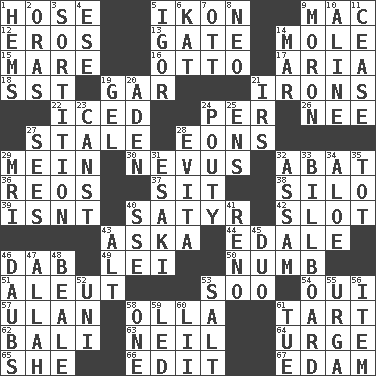 ACROSS 1. Flexible conduit 5. Picture 9. Apple computer (short form) 12. Greek god of love 13. Yard entry 14. Undercover agent 15. Female horse 16. "Beetle Bailey" pooch 17. Roberta Peters solo 18. Fast jet (abbr.) 19. Slender fish 21. Removes the wrinkles 22. On the rocks 24. For each 26. Born 27. Showing deterioration from age 28. Immeasurably long periods of time 29. Chow _ 30. Mole, birthmark 32. Blind as ____ 36. Vintage cars 37. Be seated 38. Grain storage tower 39. Is not 40. Man with strong sexual desires 42. Groove 43. "____ silly question..." 44. Peak District village in England 46. Pat or tap gently 49. Flowery wreath 50. Unfeeling 51. Native American of Southwest Alaska 53. "Barney Miller" actor Jack 54. Fr. "Yes" 57. Uhlan (variant) 58. Rounded earthenware pot or jar 61. Small pie 62. Indonesian resort city 63. Famous astronaut Armstrong 64. Goad 65. A female animal or person 66. Prepare for publication 67. Dutch treat DOWN 1. Equivocates 2. Mouths or openings 3. Decision 4. Compass dir. 5. Russian composer Stravinsky 6. Krazy ___ of comics 7. Baseball player Mel 8. Modern: prefix 9. Person of subnormal intelligence 10. Place in a line 11. Stop 14. Make imperfect 19. Set 20. Arabian gulf 21. Big collection agency 23. 2nd pers. sing. pres. of can (arch.) 24. Inclined to pout 25. Followers of ems 27. Perceives with the eye 28. Webber/Rice musical 29. Medical imaging device (abbr.) 31. 1973 Nobel Price Winner (Physics) Leo 32. Indian state 33. Big road sign 34. _ vera 35. Small child 40. Compass dir. 41. Former U.S. Attorney General Janet 43. The first octave above the treble staff 45. Superhero pair 46. Applies to a surface 47. Assad's deity 48. Calif. Air Force Base 52. University (slang) 53. Table seasoning 55. Capital and largest city of Mongolia 56. A whole individual unit 58. Single 59. Directed 60. Cards in a Roman deck? 61. Third day of the wk.