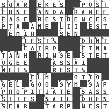 ACROSS 1. Fly high 5. Makes supply last 9. Mail 13. Celtic language 14. Small Philippine buffalo 15. Indian princess (variant) 16. Relaxation 17. Dwellings 19. Parent Teacher Association (abbr.) 20. One (Scot) 21. Cards in a Roman deck? 22. Eastern Standard Time (abbr.) 23. Independent ruler or chieftain 25. Elected rep. 26. Trials 30. Do not 34. Capital of Egypt 35. Inactive volcano in Sicily 36. Hyperbolic tangent 39. Remove soap 42. Proofreading order 43. Double curve, resembling the letter S 44. Slender Brazilian palm 46. Moistens 47. Musical pauses 48. Shade tree 51. "Beetle Bailey" pooch 54. Set 57. Thick or sticky substance 58. Symbol (abbr.) 60. Plant excrement 62. Conciliate 65. Backtalk 66. Settings 67. Move on water 68. Lyric poems 69. Wither 70. Canvas cover 71. Egg locale DOWN 1. Ooze 2. Speak pompously 3. Indian state 4. Portuguese money of account (variant) 5. Merit 6. Leg joint 7. Greek goddess of the dawn 8. Moves on water 9. Baking dish 10. Single time 11. Perceives with the eye 12. Trial 15. It's straight from the horse's mouth 18. Pass on 20. Length times width 24. Strong, restless desires 27. Title for a knight 28. Three (prefix) 29. Echolocation 30. Cease 31. Baseball player Mel 32. Compass dir. 33. Make lace 36. Pull behind 37. Mature 38. Fish or hair follower 40. Compass dir. 41. Double-curved letter 45. Smallest unit of an element 48. The front part of a cuirass 49. Car dealer's back yard 50. Damp 52. Sadhe (variant) 53. Fertile tracts in a desert 54. Global Positioning Systems (abbr.) 55. 4th largest of the Great Lakes 56. Globular water bottle used in Asia 58. Move through with a circular motion 59. Sharp bark 61. Inconspicuous attention getter 63. For each 64. American Automobile Association (abbr.) 65. Male child