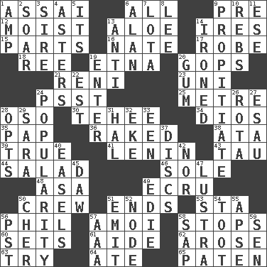 ACROSS 1. Slender Brazilian palm 6. Everything 9. Before (prefix) 12. Wet 13. Medicinal plant 14. Angers 15. Components 16. Nathan's nickname 17. Loose flowing garment 18. Portuguese money of account (variant) 19. Inactive volcano in Sicily 20. Republicans 21. Painter Guido (1575-1642) 23. Corn or form start 24. Inconspicuous attention getter 25. Distance measurement (Brit.) 28. Bear (Spanish) 30. Giggle 34. "Vaya con ____" 35. Infant food 36. Moved through 38. _ moment's notice (2 wds.) 39. Loyal 41. Soviet premier 1918-24 43. The 19th letter of the Greek alphabet 44. Vegetable dish 46. Not divided or shared with others 48. White ___ sheet 49. Shade of tan 50. Ship's personnel 51. Extremities 53. R.R. building 56. Silvers or Donahue 57. Mine, in Marseilles 58. Closes up, plugs up 60. Puts into a specified state 61. Assistant 62. Came up 63. Attempt to accomplish something 64. Had dinner 65. Eucharist need DOWN 1. Electrical Unit 2. Fly high 3. Male parent of an animal 4. Michaelmas daisies 5. It is 6. Actor Alda or Thicke 7. Globular water bottle used in Asia 8. Area sheltered from the wind 9. Appease 10. Confederate soldiers (slang) 11. Compass dir. 13. Opposed to 14. Pressed 19. Keyboard key 20. Chewing product 22. Eastern Standard Time (abbr.) 24. Teen's desire 26. Round or rotation of duties 27. He sold his birthright 28. Chooses 29. "Two Mules for Sister ____" 31. Actor Linden 32. Make supply last 33. Car or cant ending 37. Plates 40. Artist's stands 42. Not either 45. Simpleton 47. A period of five years 49. Singer Brickell 50. "Mermaids" star 51. Give off 52. Thickened enlargement 54. A blast of a horn 55. Domed church section 56. Pacific Standard Time (abbr.) 57. Auto club (abbr.) 58. Plant excrement 59. Elected rep.