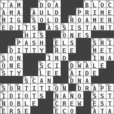 ACROSS 1. Scottish cap 4. ___ good deed 7. Alliance 11. Housemaid (var.) 12. Old (Scot.) 13. First class 14. Russian fighter aircraft 15. Exchanged or delivered for money 16. Wanderer 17. Proofreads 19. Aide 21. Part of HMS, perhaps 23. Washington bills 24. Romantic infatuation 25. Raised railways 26. _ Lanka 29. Short, simple song 30. To sift 31. Was introduced to 32. Male child 33. Indiana (abbr.) 34. _ tizzy (2 wds.) 35. Single 36. _-fi 37. A sleeping potion; an opiate (poet.) 40. Filthy place 41. Area sheltered from the wind 42. Assistant 43. Examine minutely or intensely 45. Heredity factor (abbr.) 46. Drawing lots 51. Window treatment 55. Foolish or stupid persons 56. Billionth: prefix 58. Fast jet (abbr.) 59. Having high moral qualities 60. Group working together 61. Eastern Standard Time (abbr.) 62. Celtic language 63. Environmental prefix 64. "One Day ___ Time" DOWN 1. Docile 2. Among 3. Wise men 4. Superhero pair 5. Rounded earthenware pot or jar 6. Does sums 7. Naughty children 8. Pale green bean 9. Sign of something about to happen 10. Certainty 12. Help 13. Airs 16. Wash lightly 18. Not this but _ 20. Having a sole or soles 22. Like a shrinking violet 24. Abounding in pines 25. Bert's buddy 26. Grin 27. French philosopher Descartes 28. Call ___ day 29. Do not 32. Mayday 33. Ancient Celtic tribe of eastern Britain 36. Narrow boards 37. June honoree 38. Light entry point 39. The sixth month of the Jewish calendar 43. Took without asking 44. Quote 46. Trig term 47. Scent 48. Chest bones 49. Single time 50. Drug cop 52. At sea 53. Inconspicuous attention getter 54. Singer James 57. Modern: prefix