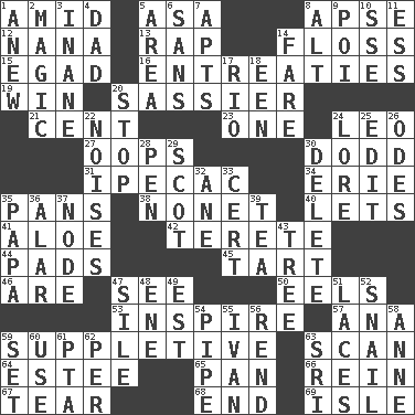 ACROSS 1. Among 5. White ___ sheet 8. Domed church section 12. Nanny 13. Reproach for some lapse or misdeed 14. Soft thread for cleaning between teeth 15. Mild oath 16. Pleas 19. Victory 20. More lively and spirited 21. Penny 23. Single 24. Lion 27. I made a mistake 30. Texas town _ City 31. Medicinal drug used to evoke vomiting 34. One of the Great Lakes 35. Zero-star reviews 38. Music written for nine 40. Allows 41. _ vera 42. Cigar-shaped 44. Writing tablets 45. Small pie 46. "We ___ not amused" (Victoria) 47. Perceive with the eye 50. Snakelike fish 53. Motivate 57. Santa ___, CA 59. Supplementary 63. Glance over 64. First name in cosmetics 65. Baking dish 66. It's straight from the horse's mouth 67. Pull into pieces 68. Conclude 69. Small island DOWN 1. Afresh 2. Mysterious quality of enchantment 3. Empty; void 4. June honoree 5. Type of rug 6. Without 7. Flats, for short 8. Keyboard modifier key 9. Luau course 10. Compass dir. 11. Curvy letter 14. Conductor's collection 17. River (Sp.) 18. Car or cant ending 20. Obstruct or block passage 22. Annoying sounds 24. Old wives' tales, e.g. 25. Prepare for publication 26. Lyric poems 28. Writing instrument 29. Highlander 30. Keyboard key 32. One (Scot) 33. Sure thing 35. Dad 36. Having or resembling wings 37. Connecting point 39. Beverage made from leaves 43. Woody plant 47. Filth; sediment 48. Compass dir. 49. Eastern Standard Time (abbr.) 51. Shoestrings 52. Slow-paced one 54. Corncob 55. _ the terrible 56. Tear apart 58. Queen of England 1702-14 59. Put into a specified state 60. Purpose 61. Parent Teacher Assoc. 62. For each 63. Indian title of respect (Mr.)