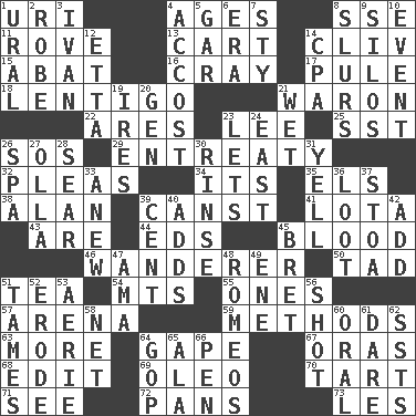 ACROSS 1. RI univ. 4. Eras 8. Compass dir. 11. Be footloose 13. Haul 14. 154 in Roman numerals 15. Blind as ____ 16. Supercomputer manufacturer 17. Whine 18. Small, flat, pigmented spot on the skin 21. Make _____ (do battle with) 22. Ancient Greek god of war 23. Area sheltered from the wind 25. Fast jet (abbr.) 26. Distress signal 29. Plea 32. Entreaties 34. ___ a Wonderful Life 35. Raised railways 38. Actor Alda or Thicke 39. 2nd pers. sing. pres. of can (arch.) 41. Globular water bottle used in Asia 43. "We ___ not amused" (Victoria) 44. Begley and Asner 45. Vital fluid 46. Nomad 50. Bit 51. Afternoon social gathering 54. Mountains (abbr.) 55. Washington bills 57. Sports stadium 59. Modes 63. Greater amount 64. Stare wonderingly 67. Mouths or openings 68. Prepare for publication 69. Butter sub 70. Small pie 71. Observe 72. Zero-star reviews 73. French article DOWN 1. Mountain range 2. Loose flowing garment 3. "Terrible" tsar 4. Buttonhole 5. Slender fish 6. Period 7. Filthy place 8. Plays smoothly or legato 9. Grain storage towers 10. Incident 12. Singer James 14. Tax preparer (abbr.) 19. Angers 20. Commissioned mil. rank 21. Soggy 23. Allows 24. Compass direction 26. Health resort 27. Rounded earthenware pot or jar 28. Burn superficially 30. Wash lightly 31. Shout 33. Afresh 36. Spoils 37. Portico 39. Penny 40. Does sums 42. Find the sum of 45. Cy Young winner Saberhagen 47. Wet nurse (var.) 48. Lover boys 49. Compass dir. 51. Domesticates 52. Eat (away) 53. Nest on high 56. Opportunity 58. Remaining after all deductions 60. Taken by mouth 61. Have the gumption 62. Fast planes 64. Grand Old Party 65. According to 66. Fenced enclosure