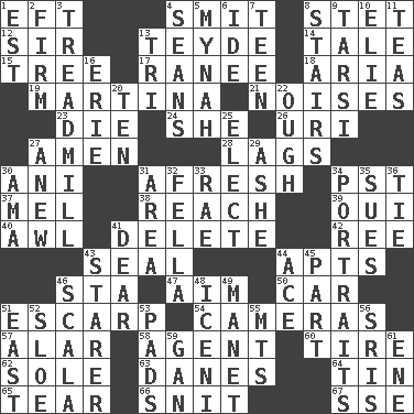 ACROSS 1. Bank Draft (abbr.) 4. Stricken, poetically 8. Proofreading order 12. Title for a knight 13. Miss Universe 1986, Barbara Palacios _ 14. Lie 15. Woody plant 17. Indian princess (variant) 18. Operatic vocal solo 19. Chrissie's court nemesis 21. Annoying sounds 23. Pass on 24. A female animal or person 26. RI univ. 27. So be it 28. Fails to keep up a pace 30. Black tropical American cuckoo 31. Anew 34. Pacific Standard Time (abbr.) 37. Cartoonist voice _ Blanc 38. Arrive at 39. Fr. "Yes" 40. Leather borer 41. Keyboard key 42. To separate or throw off 43. Lick closed 44. Tenement units (abbr.) 46. R.R. building 47. Direct toward a target or goal 50. Auto 51. Fortification 54. Devices for capturing images 57. Having or resembling wings 58. Representative 60. Become fatigued 62. Flatfish 63. Natives or inhabitants of Denmark 64. Shallow baking pan 65. Rend 66. In a ____ (agitated or irritated) 67. Compass dir. DOWN 1. Eastern Standard Time (abbr.) 2. Securely fixed in place 3. Excercise machine 4. Seines 5. Non-adult bird? 6. Binary compound 7. Adolescent 8. Flight of steps 9. Tarsus (plural) 10. Writer Wiesel 11. Beverages made from leaves 13. Three (prefix) 16. One of the Great Lakes 20. Nine, plus one 22. Ending for "Through" and "Enough" 25. Choose 27. Afresh 29. American tennis player Robert 30. Nanny (var.) 31. Length times width 32. Man or boy (slang) 33. Actress Charlotte 34. Likenesses of persons 35. Institutes legal proceedings 36. Make a knot 41. Letter starter 43. A viewer who gazes fixedly 44. Adept person 45. Piece 46. Any of the three canals of the cochlea 48. Ancient Celtic tribe of eastern Britain 49. French painter Edouard 51. Compass direction 52. _ gin 53. Groovy apts. 55. Mountains (abbr.) 56. Indian titles of respect 59. Separate the seeds from cotton 61. Compass dir.