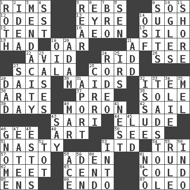 ACROSS 1. Basketball hoops 5. Confederate soldiers (slang) 9. Mayday 12. Lyric poems 13. Jane of fiction 14. Ending for "Through" and "Enough" 15. Portable shelter 16. Period of immesurable duration 17. Grain storage tower 18. Possessed 19. Rowing implement 21. Following 22. Enthusiastic 24. To free from 26. Compass dir. 27. Any of the three canals of the cochlea 28. Drawstring 29. Raised platform 30. Unmarried girls 32. Detail 36. Johnson of "Laugh-In" 37. Before (prefix) 38. Flatfish 39. 24-hour periods 40. Person of subnormal intelligence 42. Move on water 43. Indian skirt 44. Evade 46. Unit of force equal to gravity 49. Tate display 50. Observes 51. Characterized by obscenity 53. It would 54. Three (prefix) 57. Von Bismarck 58. An important port of Yemen 61. Part of speech 62. Confront 63. Penny 64. Lacking warmth 65. Followers of ems 66. Inside; within (prefix) 67. Margarine DOWN 1. Writer of Portnoy's Complaint (1969) 2. It may be bright or harebrained 3. Ananias' fault 4. Fast jet (abbr.) 5. Bring up, as a child 6. Sight organ 7. Sis' sibling 8. Elected rep. 9. Costumes for special activities 10. Stares 11. Dinah or Pauly 14. Order of Saint Francis (abbr.) 19. Lubricate 20. First of billions? 21. Find the sum of 23. Flower holders 24. Cowboy competition 25. Big collection agency 27. "Two Mules for Sister ____" 28. High-altitude cloud 29. June honoree 31. To the left, to Queeg 32. Come out of 33. Inedible or poisonous agaric 34. Writer Wiesel 35. Cartoonist voice _ Blanc 40. Make imperfect 41. A home for chicks 43. Declare 45. Directed 46. Dwarf 47. Eroded 48. _____ Park, CO 52. Small child 53. To the inside or interior of 55. Governing power 56. _ china 58. Adept person 59. Lair 60. Conclusion 61. Non-commissioned officer (abbr.)