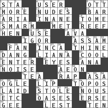 ACROSS 1. R.R. building 4. One who makes use of a thing 8. Baseball player Mel 11. Greater amount 13. Unadorned figures 15. Drinking establishment 16. Operatic vocal solo 17. Lacking in sense or substance 18. Heavy book 19. Excessive but superficial compliments 21. Was introduced to 22. Coral collection 23. Layer 24. Purpose 27. Actress Gardner 29. Russian composer Stravinsky 30. Indian state 34. Air blower 36. South American Indian 39. One or ones belonging to thee 40. Mild oath, euphamism for damn 41. Climbing, woody, usually tropical vines 43. Calm and collected 44. Keyboard key 46. Sight organs 47. Santa ___, CA 48. Annoying sound 49. Period of immesurable duration 51. Beverage made from leaves 53. Hit sharply and swiftly 54. White ___ sheet 57. Stare 60. Mouth edge 63. Traditional theme or motif 65. Put down 66. Fur scarf 69. Horse sense 70. And so on (abbr.) 71. Fertile tracts in a desert 72. Celtic language 73. Unit of force equal to gravity 74. For fear that 75. "___ Little Indians" DOWN 1. Box-office sellout 2. Singer Mel 3. Believer in; advocate of (suffix) 4. Corn or form start 5. Player for Phoenix 6. Dutch treat 7. French philosopher Descartes 8. Mitch Miller's instrument 9. Not wild 10. Unclean, religiously 12. Hearing organ 14. Bristle 18. File 13 20. Java container 25. Land 26. Bert's buddy 28. Large container 29. Consumed 31. The Jewish people; Israel 32. Small Philippine buffalo 33. Cartoonist voice _ Blanc 34. Papal veil 35. Opposed to 37. Island 38. Approach 40. Lair 42. At sea 45. To riddle 50. Choose 52. In addition 54. To the left, to Queeg 55. Boozer 56. NE Netherlands city 57. Cassini of fashion 58. Yard entry 59. Louse (plural) 61. Slanted text style (abbr.) 62. Introduce or present, as a question 64. Single 67. French article 68. Eastern Standard Time (abbr.)