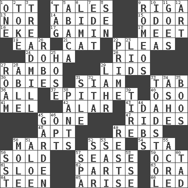 ACROSS 1. Baseball player Mel 4. Falsehoods 9. Port city in Latvia 13. And not 14. Remain 15. Scent 16. Make supply last 17. Homeless child 18. Rendezvous 19. Hearing organ 21. Feline 22. Entreaties 24. Capital of the state of Qatar 26. River (Sp.) 27. Role for Stallone 29. Flaplike coverings 30. Off-Broadway awards 31. Thailand, formerly 33. Bar bill 36. 100% 37. Curse 40. Bear (Spanish) 41. Cartoonist voice _ Blanc 42. Having or resembling wings 43. Potato state 45. Went 47. Amusement-park features 48. Fitting 49. Confederate soldiers (slang) 50. Shops 52. Compass dir. 54. R.R. building 56. Disposed of to a purchaser 57. Gospel singer Marvin 59. Sep. follower 61. _ gin 62. Components 63. Mouth or opening 64. Adolescent 65. Ascend 66. Directed DOWN 1. Single 2. Puff or smoke 3. Excercise machine 4. Label 5. Phillipine bananalike plant 6. Pale green bean 7. Prepare for publication 8. Elected rep. 9. Lover boys 10. The content of cognition 11. Travels 12. Tate display 20. Loose flowing garment 22. A-one 23. Hat (slang) 25. Stockings 27. Wander 28. Competent 29. Cowardly lion portrayer 31. Drop; flow; fall 32. Call ___ day 33. Inedible or poisonous agaric 34. American tennis player Robert 35. Expressions of contempt or scorn 38. Leg coverings 39. Become fatigued 44. Rights 45. Place where plants grow 46. Elect 49. Musical pauses 50. Undercover agent 51. _ vera 52. Singe 53. Indian skirt 55. Measure of real estate 56. Fast jet (abbr.) 57. Health resort 58. Compass dir. 60. Small amount or degree