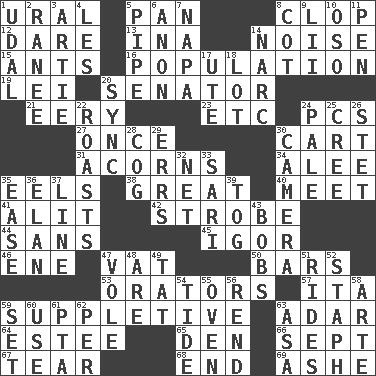 ACROSS 1. Mountain range 5. Baking dish 8. Hoof sound 12. Have the gumption 13. _ tizzy (2 wds.) 14. Annoying sound 15. Pismires 16. Census information 19. Luau accessory 20. Legislator 21. Suggestive of the supernatural 23. And so on (abbr.) 24. Personal Computers (abbr.) 27. Single time 30. Haul 31. Oak nuts 34. Toward shelter 35. Snakelike fish 38. Relatively large 40. Rendezvous 41. Set down 42. Disco prop 44. Without 45. Composer Stravinsky 46. Compass dir. 47. Large container 50. Oblong pieces of solid material 53. Speakers 57. Call ___ day 59. Supplementary 63. The sixth month of the Jewish calendar 64. First name in cosmetics 65. Lair 66. Back-to-school mo. 67. Pull apart 68. Conclude 69. American tennis player Robert DOWN 1. Hereditary estate 2. The wife of a rajah (variant) 3. Nick name for Arthur 4. French article 5. Corncob 6. Soon (poet.) 7. California wine valley 8. Small bed 9. Cards in a Roman deck? 10. Bear (Spanish) 11. Writing instrument 14. Drug cop 17. Shoshoni 18. Car dealer's back yard 20. Synchronize (abbr.) 22. Cooks with dry heat, as in an oven 24. Diluted with white 25. Algonquian 26. Proofreading order 28. Gear tooth 29. Blunders 30. Device for capturing images 32. Remaining after all deductions 33. Indian skirt 35. Relaxation 36. Flair 37. Actor's bit 39. Coat; cloak 43. Moves up and down 47. Grand slam 48. "We ___ not amused" (Victoria) 49. Make lace 51. Amusement-park features 52. Staphylococcus 54. Periodic rise and fall of the sea level 55. Baking chamber 56. Tear apart 58. Johnson of "Laugh-In" 59. Put into a specified state 60. Purpose 61. Parent Teacher Association (abbr.) 62. For each 63. White ___ sheet