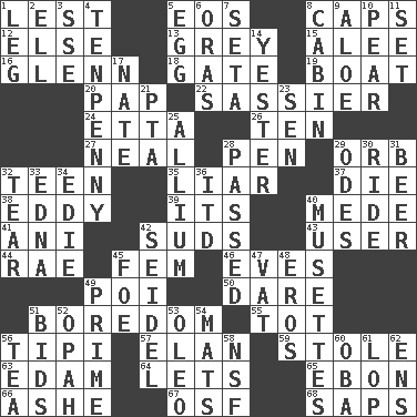 ACROSS 1. For fear that 5. Greek goddess of the dawn 8. Balmoral and tarboosh 12. Otherwise 13. Jennifer or Joel 15. Toward shelter 16. American astronaut and politician John 18. Yard entry 19. Water vessel 20. Infant food 22. More lively and spirited 24. Singer James 26. "___ Little Indians" 27. Anneal 28. Fenced enclosure 29. Globe 32. Adolescent 35. One who doesn't tell the truth 37. Pass on 38. Whirlpool 39. ___ a Wonderful Life 40. Ancient Persian 41. Black tropical American cuckoo 42. Soap bubbles 43. One who makes use of a thing 44. Actress Charlotte 45. Opposite of masc. 46. Nights before holidays 49. Luau course 50. Have the gumption 51. Mood resulting from idleness 55. Small child 56. Native american tent (variation) 57. Enthusiasm 59. Fur scarf 63. Dutch treat 64. Allows 65. Inky black, to poets 66. American tennis player Robert 67. Order of Saint Francis (abbr.) 68. Plant excrements DOWN 1. Part of a journey 2. Pipe bend 3. Compass dir. 4. 3-inch nail 5. Oval reproductive body of a fowl 6. Mouths or openings 7. Bristle 8. Apartment or room in a ship 9. Medicinal plant 10. Lightbulb-shaped fruit 11. Arrange properly for use 14. Next before 17. Nathan's nickname 21. Parent Teacher Association (abbr.) 23. Elected rep. 25. Plant genus of onion and garlic 28. Went by 29. Lyric poems 30. Travel on an animal 31. Fermented drink made from hops 32. Pull apart 33. Pulitzer Prize-winning author Ferber 34. Singer Brickell 36. It would 40. French bagpipes 42. A glass for beer 45. Enemy 47. Large container 48. Greek god of love 49. A-one 51. Auction offers 52. Brightly colored fish 53. Butter sub 54. Floor coverings 56. Afternoon social gathering 58. Overdraft (abbr.) 60. Chief or king in Benin or Nigeria 61. Chop off 62. Followers of ems
