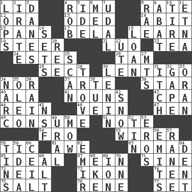 ACROSS 1. Flaplike covering 4. Tall New Zealand timber tree 8. Assign a rank or rating to 12. Mouth or opening 13. Wrote a lyric poem 14. "This won't hurt ____!" 15. Zero-star reviews 17. Actor Lugosi 18. Acquire or gain knowledge or skills 19. Bull 21. Nilotic language 23. Beverage made from leaves 24. _____ Park, CO 26. Scottish cap 28. Religious group 30. Small, flat, pigmented spot on the skin 34. And not 37. Johnson of "Laugh-In" 39. Play the lead 40. Wing 41. Parts of speech 43. Accounting whiz (abbr.) 44. It's straight from the horse's mouth 46. Distinctive style or manner 47. Layer 48. Ingest 51. Brief written record 54. Away 55. One who wires 58. Nervous spasm 61. Deep reverence 63. Roamer 65. Perfect 67. Chow _ 71. Trig term 72. Famous astronaut Armstrong 73. Image 74. Nine, plus one 75. Table seasoning 76. French philosopher Descartes 77. Put into a specified state DOWN 1. Chops off 2. Feeling or showing extreme anger 3. Natives or inhabitants of Denmark 4. Director Reiner 5. Binary compound 6. Cartoonist voice _ Blanc 7. Hereditary estate 8. Actress Charlotte 9. Blind as ____ 10. Become fatigued 11. Inactive volcano in Sicily 16. Puts into a specified state 18. Grant temporary use of 20. To riddle 22. Shoshoni 25. Glance over 27. Mountains (abbr.) 29. Collection of objects 30. Soviet premier 1918-24 31. Hankering 32. Open wide 33. Northwest Algerian city 34. Drug cop 35. Margarine 36. Water falling in drops from the sky 38. Third day of the wk. 42. Frozen precipitation 45. Science/research agcy. 49. Mountain range 50. Cut the grass 52. Shallow baking pan 53. Greek god of love 56. Gives off 57. The wife of a rajah (variant) 58. Airtight sealed metal containers 59. The content of cognition 60. To provide with a ceiling 62. Independent ruler or chieftain 64. Gouge 66. The first octave above the treble staff 68. Make supply last 69. Electrically charged atom 70. Compass dir.