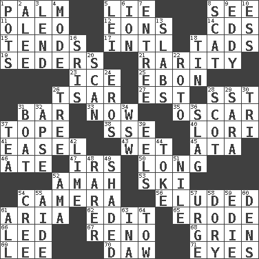 ACROSS 1. Inside of hand 5. Whopper 8. Perceive with the eye 11. Butter sub 12. Immeasurably long periods of time 14. Music discs 15. Is inclined (to) 17. International (abbr.) 18. Small boys 19. Spring feasts 21. Noteworthy scarcity 23. Frozen water 25. Inky black, to poets 26. Russian ruler of old 27. Eastern Standard Time (abbr.) 28. Fast jet (abbr.) 31. Drinking establishment 33. Immediately 35. Motion picture award 37. Drink excessively 38. Compass dir. 40. Australian parrot (variant) 41. Artist's stand 43. Dripping 45. _ moment's notice (2 wds.) 46. Had dinner 47. Big collection agency 50. Protracted 52. Wet nurse 53. What Jean-Claude Killy likes to do 54. Device for capturing images 56. Evaded 61. Operatic vocal solo 62. Prepare for publication 65. Eat (away) 66. Directed 67. Western Nevada city 68. Smile widely 69. Area sheltered from the wind 70. Fool 71. Snake ____ (dice throw) DOWN 1. Cooking vessels 2. Toward shelter 3. Grant temporary use of 4. Method 5. Flowery wreath 6. Electrically charged atom 7. Main course 8. Go away! 9. Whirlpool 10. Double-curved letter 13. Thick slices 16. Indian titles of respect 18. Metal container 20. Skim 22. Printing process, for short 24. Greek god of love 26. Woody plant 28. Highlander 29. "Two Mules for Sister ____" 30. Three (prefix) 31. Water vessel 32. Domed church section 34. Compass dir. 36. Volcanic refuse 37. Beverage made from leaves 39. Snakelike fish 42. Citrus frut 44. Puff or smoke 48. More uncommon 49. Cast a shadow over 51. "Death on the ____" 52. Wet nurse (var.) 54. Algonquian 55. Helper 57. Goad 58. Dinghy 59. Singer Brickell 60. Lairs 61. Everything 63. _ tizzy (2 wds.) 64. Pull behind