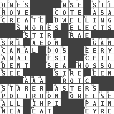 ACROSS 1. Washington bills 5. Overdraft (abbr.) 8. Be seated 11. Be footloose 12. ____ d'Azur (French Riviera) 13. White ___ sheet 14. Cause to be 17. Home 19. Sounds asleep 21. Opts 22. Use a spoon 23. Actress Charlotte 24. _ Lanka 27. A really long time 29. Separate the seeds from cotton 32. Lessep's creation 34. Two (Sp.) 36. Suggestive of the supernatural 37. Of or related to the anus 38. Eastern Standard Time (abbr.) 39. To provide with a ceiling 40. Undesirable depression on a surface 41. Ocean 42. With motion or animation 43. Perceive with the eye 44. The founder of a family 46. Car or cant ending 47. American Automobile Association (abbr.) 50. College mil. group 52. A viewer who gazes fixedly 55. Michaelmas daisies 57. Coward 59. Threatening words 62. 100% 63. Body of Kaffir warriors 64. Ache 65. Teachers' org. 66. Ingest 67. Jane of fiction DOWN 1. The grampus (Milton) 2. And not 3. Nights before holidays 4. Seines 5. Immediately 6. Navigate 7. Chap (slang) 8. Ketch in the Levant 9. Is not 10. Labels 12. Music discs 15. "_____ Recall" 16. 4th largest of the Great Lakes 18. Area sheltered from the wind 20. Eats (away) 24. Oodles 25. Indian princess (variant) 26. Silly 28. Olfactory organs 29. Honkers 30. Ascend 31. Thermoplastic polyamide 33. Keyboard modifier key 35. Flight of steps 36. Environmental prefix 42. Distance measurement 45. Printing process, for short 47. Nonscientific branch of learning 48. Nest on high 49. Odor 51. Streamer paper 52. Connect, as a bridge 53. Lacquered or enameled metalware 54. Silent film actress Nazimova 55. Cuckoo 56. Kill 58. Choose 60. Title for a knight 61. Compass dir.