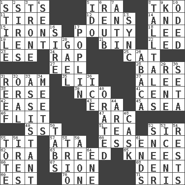 ACROSS 1. Fast planes 5. Lyricist Gershwin 8. Ring climax 11. Become fatigued 12. Lairs 14. Also 15. Removes the wrinkles 17. Inclined to pout 18. Area sheltered from the wind 19. Small, flat, pigmented spot on the skin 21. Storage container 22. Directed 23. Compass dir. 24. Hit sharply and swiftly 25. Feline 27. Snakelike fish 28. Drinking establishments 31. Wander 35. Cards in a Roman deck? 37. Toward shelter 38. Celtic language 39. Non-commissioned officer (abbr.) 41. Penny 42. Relaxation 43. Period 45. Toward the sea 46. Sudden quick movement 47. Curve 49. Fast jet (abbr.) 51. Afternoon social gathering 52. Title for a knight 55. Teat (slang) 57. _ moment's notice (2 wds.) 60. Substance 62. Mouth or opening 63. A special lineage 65. Leg joints 66. "___ Little Indians" 67. The Jewish people; Israel 68. Gouge 69. Eastern Standard Time (abbr.) 70. Single 71. Indian titles of respect DOWN 1. Vertical member of a panel or frame 2. Male parents of animals 3. Heavy duty weighing machine 4. Transmitted 5. Wedding promise 6. Reuben's nickname 7. Opposed to 8. Baron Munchausen's specialties 9. Leg joint 10. Wrote a lyric poem 13. Synchronize (abbr.) 16. Father 17. Cotton for raincoats, e.g. 20. Highlander 26. Phillipine bananalike plant 29. French philosopher Descartes 30. Bristle 31. Coral collection 32. Taken by mouth 33. Aide 34. Confronts 36. Frozen water 40. Declaimed 44. Ancient Greek god of war 48. Keg 50. Bar bills 52. Contemptuous expression 53. Ancient Celtic tribe of eastern Britain 54. Musical pauses 55. Lug 56. Angers 58. Musical group of three 59. A really long time 61. Conclusions 64. Compass dir.