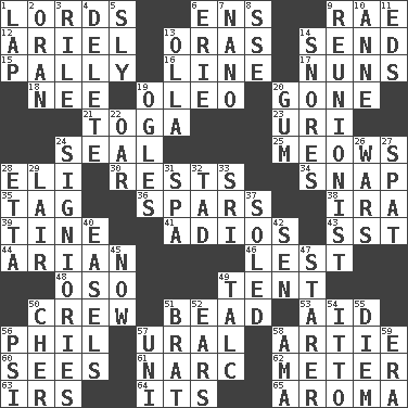 ACROSS 1. Domineers 6. Followers of ems 9. Actress Charlotte 12. Satellite of Uranus 13. Mouths or openings 14. Post 15. Friendly 16. Actor's bit 17. Religious women 18. Born 19. Butter sub 20. Went 21. Ancient Roman robe 23. RI univ. 24. Lick closed 25. Catcalls? 28. Biblical high priest 30. Musical pauses 34. Fastener 35. Label 36. Practice fights 38. Lyricist Gershwin 39. Prong on a fork 41. Goodbye (Sp.) 43. Fast jet (abbr.) 44. Believer in; advocate of (suffix) 46. For fear that 48. Bear (Spanish) 49. Portable shelter 50. Group working together 51. Necklace unit 53. Assist 56. Silvers or Donahue 57. Mountain range 58. Nick name for Arthur 60. Observes 61. Drug cop 62. Distance measurement 63. Big collection agency 64. It is 65. Scent DOWN 1. Pet locale 2. NW Algerian seaport 3. Cause heat under the collar 4. Keyboard key 5. Cunning 6. One of the Great Lakes 7. Billionth: prefix 8. Compass dir. 9. One who advocates reunion 10. Singer Murray 11. Begley and Asner 13. Water jar 14. Sounds asleep 19. Stares at amorously 20. Chewing product 22. Boat paddle 24. Seigniories (variant) 26. Armed conflicts 27. Petty quarrel 28. Singer James 29. Den 31. Health resort 32. Small boy 33. _ Lanka 37. Having a sole or soles 40. Artist's stands 42. Elected rep. 45. At this time 47. A viewer who gazes fixedly 49. Baby powder 50. "Mermaids" star 51. Naughty child 52. Hearing organs 54. "Tell ____ the Marines!" 55. South Vietnam president (1954) 56. Air pressure measure (abbr.) 57. University (slang) 58. Nanny (var.) 59. Period