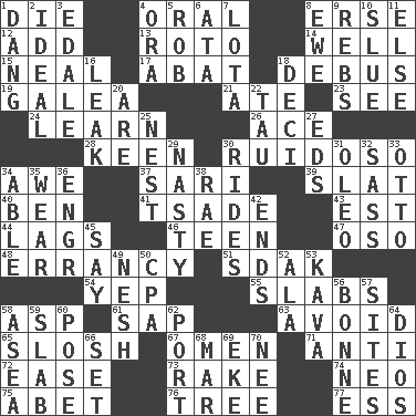 ACROSS 1. Pass on 4. Spoken 8. Celtic language 12. Increase 13. Printing process, for short 14. Not ill 15. Be tempered by heat 17. Blind as ____ 18. To get out of a bus 19. An organ shaped like a helmet 21. Had dinner 23. Observe 24. Memorize 26. Adept person 28. Peachy ____! 30. Noisy, rowdy, vocal (Spanish) 34. Deep reverence 37. Indian skirt 39. Narrow board 40. Benjamin's nick name 41. Sadhe (variant) 43. Eastern Standard Time (abbr.) 44. Straggles 46. Adolescent 47. Bear (Spanish) 48. Tendancy to err 51. Neighbor of Neb. 54. Slangy assent 55. Broad, flat, thick pieces 58. Viper 61. Plant excrement 63. Prevent from happening 65. Splash clumsily 67. Sign of things to come 71. Opposed to 72. Comfort 73. Libertine 74. Modern: prefix 75. Collude with 76. Family _ (genealogy) 77. Double-curved letter DOWN 1. Mild oath, euphamism for damn 2. Perfect 3. Peak District village in England 4. Mouth or opening 5. Director Reiner 6. "One Day ___ Time" 7. Globular water bottle used in Asia 8. She-sheep 9. Confederate soldiers (slang) 10. Turn sharply 11. Otherwise 16. Path through which fluid escapes 18. Tenth: prefix 20. "We ___ not amused" (Victoria) 22. The 19th letter of the Greek alphabet 25. Egg locale 27. Begley and Asner 29. Thoroughly unpleasant 30. Amusement-park features 31. Margarine 32. Backtalk 33. Von Bismarck 34. Competent 35. Erode 36. Engineer (abbr.) 38. Actress Charlotte 42. Conclusions 45. Declare 49. Delicate 50. Tax preparer (abbr.) 52. According to 53. Polynesian shrub of the pepper family 56. Child's nurse 57. Settings 58. At sea 59. Broad, flat, thick piece 60. Introduce or present, as a question 62. Left side of a ship or aircraft 64. "Vaya con ____" 66. Put into a specified state 68. Third mo. 69. Make supply last 70. Born