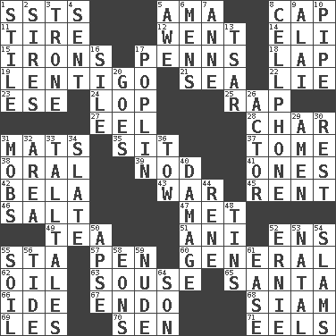 ACROSS 1. Fast planes 5. Nanny (var.) 8. Head covering 11. Become fatigued 12. Gone 14. Biblical high priest 15. Removes the wrinkles 17. Actor Sean's family 18. Pet locale 19. Small, flat, pigmented spot on the skin 21. Ocean 22. Falsehood 23. Compass dir. 24. Chop off 25. Strike 27. Snakelike fish 28. Burn to charcoal 31. Floor protectors 35. Be seated 37. Heavy book 38. Taken by mouth 39. Lower and raise head in agreement 41. Washington bills 42. Actor Lugosi 43. Armed conflict 45. Monthly bill 46. Table seasoning 47. Was introduced to 49. Beverage made from leaves 51. Cuckoo 52. Followers of ems 55. R.R. building 57. Animal enclosure 60. Commissioned military rank 62. Lubricate 63. Lush 65. Before Barbara or Clara 66. Binary compound 67. Inside; within (prefix) 68. Thailand, formerly 69. French article 70. Elected rep. 71. Snakelike fish DOWN 1. Vertical member of a panel or frame 2. Male parents of animals 3. Marketplace scale 4. Transmitted 5. Deep reverence 6. Not women's 7. Singer Murray 8. Portable communications device 9. Mountain range southwest of Kyrgyzstan 10. Corncob 13. Russian ruler of old 16. Filth; sediment 17. Cotton for raincoats, e.g. 20. Travels 26. Thespian 29. So be it 30. Remainder 31. Disorderly crowds 32. Length times width 33. Baron Munchausen's specialties 34. Chalkboard 36. Pull behind 40. Break 44. French philosopher Descartes 48. Canisters 50. Domed church section 52. Bert's buddy 53. Brizilian seaport 54. Hits or strikes with great force 55. The visible part of the earth's surface 56. Periodic rise and fall of the sea level 58. Immeasurably long periods of time 59. Naked 61. Comfort 64. Boy, to dad