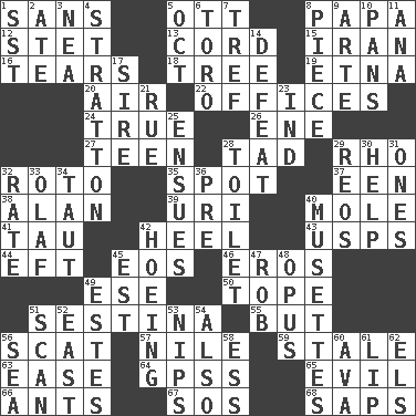 ACROSS 1. Without 5. Baseball player Mel 8. Dad 12. Proofreading order 13. Drawstring 15. SW Asia republic 16. Pulls apart 18. Woody plant 19. Inactive volcano in Sicily 20. Atmosphere 22. Public positions 24. Loyal 26. Compass dir. 27. Adolescent 28. Small amount or degree 29. 17th letter of the Greek alphabet 32. Printing process, for short 35. Specific locale 37. Car or cant ending 38. Actor Alda or Thicke 39. RI univ. 40. Undercover agent 41. The 19th letter of the Greek alphabet 42. The bottom of a shoe or boot 43. United States Postal Service (abbr.) 44. Bank Draft (abbr.) 45. Greek goddess of the dawn 46. Greek god of love 49. Compass dir. 50. Drink excessively 51. French poetic form 55. On the contrary 56. Scram, to a cat 57. Mediterranean tributary 59. Showing deterioration from age 63. Relaxation 64. Global Positioning Systems (abbr.) 65. Tending to cause great harm 66. Pismires 67. Distress signal 68. Plant excrements DOWN 1. Fast jet (abbr.) 2. Had dinner 3. Teachers' org. 4. Ski resort town in Vermont 5. Sep. follower 6. "Corrida" creature 7. Unclean, religiously 8. Part 9. Johnson of "Laugh-In" 10. Baking dishes 11. Santa ___, CA 14. Outscore 17. Title for a man of rank and authority 21. Regret 23. Working for oneself (abbr.) 25. Follows as a consequence or result 28. Bathroom plumbing fixture 29. Vintage cars 30. Assist 31. Washington bills 32. Pace 33. Norwegian king 34. Pulled tight 36. Before (prefix) 40. French bagpipes 42. Cultivating 45. Eastern Standard Time (abbr.) 47. Director Reiner 48. Musical composition 49. _____ Park, CO 51. Skim 52. Compass direction 53. Pinches, bites 54. In addition 56. Ocean 58. Double-curved letter 60. Actress Gardner 61. Mouth edge 62. Raised railways
