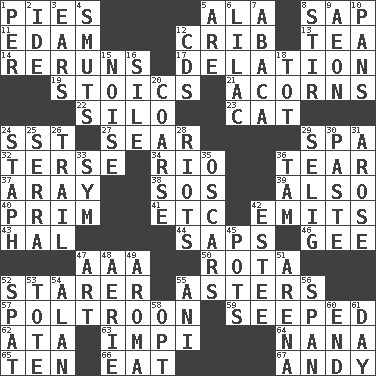 ACROSS 1. Sliced desserts 5. According to 8. Plant excrement 11. Dutch treat 12. Baby bed with high sides 13. Beverage made from leaves 14. Summer TV shows 17. Accusation by an informer 19. Unemotional ones 21. Oak nuts 22. Grain storage tower 23. Feline 24. Fast jet (abbr.) 27. Singe 29. Health resort 32. Laconic 34. _ de Janeiro 36. Rend 37. Like ___ of sunshine 38. Distress signal 39. In addition 40. Demure 41. And so on (abbr.) 42. Gives off 43. Actor Linden 44. Plant excrements 46. Unit of force equal to gravity 47. Auto club (abbr.) 50. Roll call or roster of names 52. A viewer who gazes fixedly 55. Michaelmas daisies 57. Coward 59. Oozed 62. "One Day ___ Time" 63. Body of Kaffir warriors 64. Grandmother 65. Nine, plus one 66. Erode 67. Actor Griffith DOWN 1. For each 2. Binary compound 3. Hearing organs 4. Particles of soot 5. "We ___ not amused" (Victoria) 6. Pale purple color 7. Phillipine bananalike plant 8. Move through with a circular motion 9. A really long time 10. Baking dishes 12. Music discs 15. Annoying sound 16. Drop; flow; fall 18. Small child 20. Unrefined 24. Staphylococcus 25. Spanish missionary in California 26. Go after with the intent to catch 28. Disturbances 29. Former Milwaukee Brewers owner Bud 30. Thick mixture 31. Came up 33. Symbol (abbr.) 35. Motion picture awards 36. Scottish cap 42. First name in cosmetics 45. Cooking vessels 47. Tate display 48. Nest on high 49. Scent 51. Sports stadium 52. Petty quarrel 53. Haul 54. Actor Alda or Thicke 55. Cuckoo 56. Connect, as a bridge 58. Choose 60. Conclude 61. 24 hours