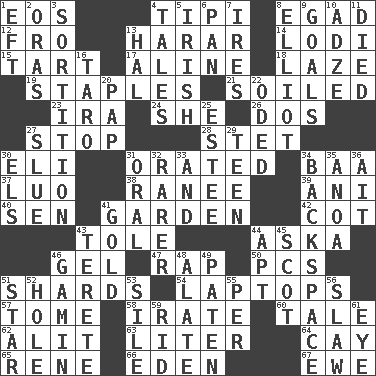 ACROSS 1. Greek goddess of the dawn 4. Native american tent (variation) 8. Mild oath 12. From 13. Ethiopian city, capital of Harari 14. Farming town in central California 15. Small pie 17. Place in a line 18. Goldbrick 19. Paper fasteners 21. Dirtied 23. Lyricist Gershwin 24. A female animal or person 26. Two (Sp.) 27. Discontinue 28. Proofreading order 30. Connecticut Ivy Leaguer 31. Spoke pompously 34. Sound made by sheep 37. Nilotic language 38. The wife of a rajah (variant) 39. Black tropical American cuckoo 40. Elected rep. 41. Place where plants grow 42. Small bed 43. Lacquered or enameled metalware 44. "____ silly question..." 46. Set 47. Reproach for some lapse or misdeed 50. Personal Computers (abbr.) 51. Pottery fragments 54. Portable computers 57. Heavy book 58. Feeling or showing extreme anger 60. Falsehood 62. Came down and settled, as after flight 63. 61 cubic inches 64. Island 65. French philosopher Descartes 66. Paradise 67. She-sheep DOWN 1. Newt 2. Mouths or openings 3. Making a chance decision by using lots 4. Stories 5. From or relating to Ireland 6. Baking dish 7. Angers 8. American author Paul (1891-1958) 9. Finish lines 10. Axlike tool, used for shaping wood 11. Passed on 13. Actor Linden 16. Edible starchy tuberous root 20. Infant food 22. Wrote a lyric poem 25. First name in cosmetics 27. Turn sharply 29. Adolescent 30. Raised railways 31. Relating to the mouth 32. More uncommon 33. Added to 34. Keyboard key 35. Small Philippine buffalo 36. Small island 41. Gilt 43. Cylindrical with tapered ends 44. Fitting 45. Highlander 46. Homeless child 48. Having winglike extensions 49. Eucharist need 51. Play the lead 52. Hollow 53. Filth; sediment 55. For each 56. Cole _ (cabbage dish) 59. To free from 61. Sight organ
