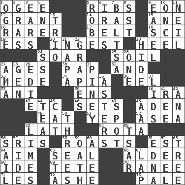 ACROSS 1. Double curve, resembling the letter S 5. Teases 9. Period of immesurable duration 12. Let have 14. Mouths or openings 15. A saturated hydrocarbon 16. Less widely known 17. Waist strap 18. _-fi 19. Curvy letter 20. Consume 23. Person who is morally reprehensible 24. Fly high 25. Land 27. Eons 30. Infant food 32. Plus 33. Ancient Persian 34. Capital of Western Samoa 36. Snakelike fish 38. Black tropical American cuckoo 39. Followers of ems 40. Retirement account (abbr.) 43. And so on (abbr.) 46. Arranges properly for use 48. Arabian gulf 49. Consume 51. Slangy assent 52. Toward the sea 53. Thin strip of wood or metal 54. Round or rotation of duties 56. Indian titles of respect 58. Cooks with dry heat, as in an oven 61. Eastern Standard Time (abbr.) 64. Direct toward a target or goal 65. Lick closed 66. Tree or shrub in the Birch family 68. Binary compound 69. Wig 70. Indian princess (variant) 71. French article 72. American tennis player Robert 73. Diluted with white DOWN 1. Legendary monster 2. Pate de foie ____ 3. Hearing organs 4. Compass dir. 5. Loose flowing garment 6. Angers 7. Greek mezzo-soprano Agnes 8. Fast jet (abbr.) 9. Artist's stand 10. At one time in the past 11. Famous astronaut Armstrong 13. Musical group of three 21. California wine valley 22. Wine fruits 23. Flintstone garb 24. Compass dir. 26. Single 27. Housemaid (var.) 28. Commissioned military rank (abbr.) 29. Singer Brickell 31. Abounding in pines 35. Michaelmas daisies 37. Flaplike coverings 41. To separate or throw off 42. Santa ___, CA 44. Afternoon social gatherings 45. Feline 47. Blemish 48. American Automobile Association (abbr.) 50. Triads 53. Citrus fruits 55. Russian ruler of old 56. Move on water 57. Travel on or in a vehicle 59. Pledge 60. Toward shelter 61. Pulitzer Prize-winning author Ferber 62. Stitch closed the eyes of (a falcon) 63. Family _ (genealogy) 65. R.R. building 67. Infant locale