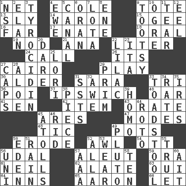ACROSS 1. Remaining after all deductions 4. Learning spot: Fr. 9. Haul 13. Roguish 14. Make _____ (do battle with) 15. Double curve, resembling the letter S 16. Distant 17. Maternal 18. Relating to the mouth 19. Dreamland 21. Santa ___, CA 22. 61 cubic inches 24. Give a ring to 26. ___ a Wonderful Life 27. Capital of Egypt 29. Romp 30. Tree or shrub in the Birch family 31. "Two Mules for Sister ____" 33. Three (prefix) 36. Luau course 37. NE Massachusetts town 40. Rowing implement 41. Elected rep. 42. A whole individual unit 43. Speak pompously 45. Ancient Greek god of war 47. Methods 48. Nervous spasm 49. Plant holders 50. Eat (away) 52. Leather borer 54. Baseball player Mel 56. Freehold land 57. Native American of Southwest Alaska 59. Mouth or opening 61. Famous astronaut Armstrong 62. Having winglike extensions 63. Fr. "Yes" 64. Taverns 65. Composer Copland 66. Allow DOWN 1. Science/research agcy. 2. Flair 3. Polypeptide antibiotic 4. She-sheep 5. Lessep's creation 6. NW Algerian seaport 7. Globular water bottle used in Asia 8. Compass dir. 9. A girl or young woman (variant) 10. Legendary monster 11. Lacerate 12. Snakelike fish 20. Have the gumption 22. Pale purple color 23. Call ___ day 25. Australian parrot (variant) 27. Balmoral and tarboosh 28. Medicinal plant 29. Demure 31. Fast planes 32. Deep reverence 33. Inedible or poisonous agaric 34. Assign a rank or rating to 35. Angers 38. Component 39. Same (prefix) 44. Printing process, for short 45. Ringlike coral islands and reefs 46. To free from 49. Cartoon dog 50. Genesis locale 51. Water falling in drops from the sky 52. Silent film actress Nazimova 53. Erode 55. Loyal 56. Corn or form start 57. American Automobile Association (abbr.) 58. Nine, plus one 60. Small island