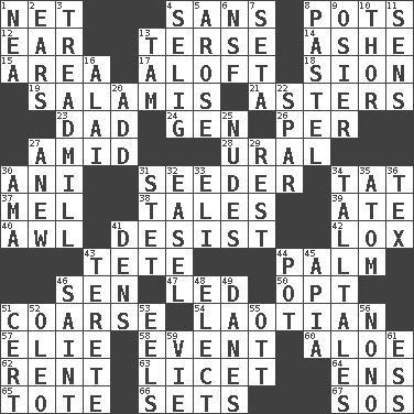 ACROSS 1. Fish or hair follower 4. Without 8. Cooking vessels 12. Ewer handle 13. Laconic 14. American tennis player Robert 15. Length times width 17. At or to great height 18. The Jewish people; Israel 19. Deli grouping 21. Michaelmas daisies 23. Male parent 24. Commissioned military rank (abbr.) 26. For each 27. Among 28. Mountain range 30. Black tropical American cuckoo 31. Sowing specialist 34. Make lace 37. Cartoonist voice _ Blanc 38. Falsehoods 39. Had dinner 40. Leather borer 41. Stop 42. Brine-cured salmon 43. False hair 44. Inside of hand 46. Elected rep. 47. Directed 50. Choose 51. Rough 54. Of or relating to Laos or its people 57. Writer Wiesel 58. Happening 60. Medicinal plant 62. Monthly bill 63. It is permitted: Lat. 64. Followers of ems 65. Haul 66. Puts into a specified state 67. Distress signal DOWN 1. Teachers' org. 2. Hearing organs 3. Excercise machine 4. Major League Baseball Commissioner Bud 5. Came up 6. Overdraft (abbr.) 7. Stalk of a moss capsule 8. Soft color 9. Flexible twig of a willow tree 10. Son of Odin 11. Elected reps. 13. Scottish cap 16. Jai _ 20. Increase 22. Coast Guard woman 25. Unadorned figures 27. Afresh 29. Relief 30. Housemaid (var.) 31. Proofreading order 32. Artist's stand 33. Biblical high priest 34. Baron Munchausen's specialties 35. Tiny particle 36. John Ritter's dad 41. Cub Scout units 43. Cigar-shaped 44. Plant holder 45. Capital of Western Samoa 46. Inhabitant of Heaven 48. Choose 49. Natives or inhabitants of Denmark 51. Certainty 52. Butter sub 53. Snakelike fish 55. Baseball player Mel 56. Words to Nanette 59. Compete 61. Curvy letter