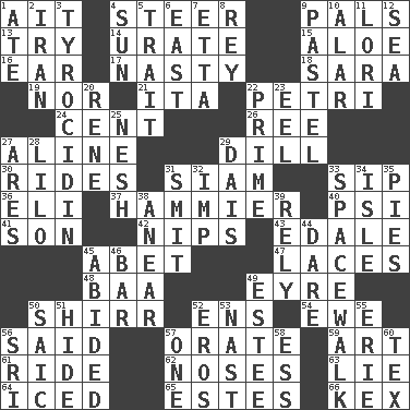 ACROSS 1. Small island 4. Bull 9. Friends 13. Attempt to accomplish something 14. A salt of uric acid 15. Medicinal plant 16. Hearing organ 17. Smutty 18. "Two Mules for Sister ____" 19. And not 21. Call ___ day 22. _ dish (used to culture cells) 24. Penny 26. To sift 27. Place in a line 29. Deli pickle 30. Amusement-park features 31. Thailand, formerly 33. Small drink 36. Biblical high priest 37. More overdramatic by comparison 40. 23rd letter of the Greek alphabet 41. Manchild 42. Cuts off 43. Peak District village in England 45. Collude with 47. Shoestrings 48. Sound made by sheep 49. Jane of fiction 50. Bake eggs in their shells 52. Followers of ems 54. She-sheep 56. Alleged 57. Speak pompously 59. Nonscientific branch of learning 61. Travel on or in a vehicle 62. Olfactory organs 63. Untruth 64. On the rocks 65. _____ Park, CO 66. Dry husk or covering DOWN 1. Had dinner 2. SW Asia republic 3. Polypeptide antibiotic 4. Player for Phoenix 5. Distinguishing feature 6. 90 degrees 7. Singer James 8. Marina Del _, California 9. Soft color 10. Having or resembling wings 11. Australian parrot (variant) 12. Ocean 20. French philosopher Descartes 22. A-one 23. Snakelike fish 25. Tender 27. Ancient Greek god of war 28. _ and Stitch 29. Raised platform 31. Stricken, poetically 32. Mischievous child 33. High altitude stroll 34. Small island 35. Sliced desserts 38. Approach 39. Have confidence or faith in 44. Have the gumption 45. Remained 46. Tavern 49. First name in cosmetics 50. Ketch in the Levant 51. Flintstone garb 52. Greek god of love 53. Political cartoonist Thomas 55. 4th largest of the Great Lakes 56. _ Lanka 57. Single 58. Curvy letter 60. John Ritter's dad