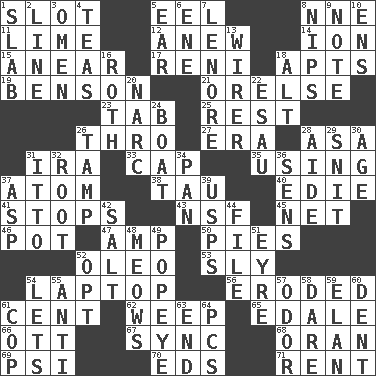 ACROSS 1. Notch 5. Snakelike fish 8. Compass dir. 11. Citrus frut 12. Afresh 14. Electrically charged atom 15. Approach 17. Painter Guido (1575-1642) 18. Flats, for short 19. Gillaume's butler role 21. Threatening words 23. Bar bill 25. Relief 26. Through, poetically 27. Epoch 28. White ___ sheet 31. Retirement account (abbr.) 33. Head covering 35. Exploiting 37. Smallest unit of an element 38. The 19th letter of the Greek alphabet 40. Singer Brickell 41. Constricts 43. Science/research agcy. 45. Fish or hair follower 46. Cooking vessel 47. Electrical Unit 50. Sliced desserts 52. Butter sub 53. Stealthy 54. Portable computer 56. Worn away 61. Penny 62. Shed a tear 65. Peak District village in England 66. Baseball player Mel 67. Synchronize (abbr.) 68. NW Algerian seaport 69. Air pressure measure (abbr.) 70. Begley and Asner 71. Monthly bill DOWN 1. Broad, flat, thick piece 2. Actor's bit 3. Sign of something about to happen 4. Beverages made from leaves 5. Hearing organ 6. Compass dir. 7. Poe poem 8. Pinches, bites 9. Observe 10. Followers of ems 13. One who wires 16. Writer of Portnoy's Complaint (1969) 18. The first octave above the treble staff 20. Drug cop 22. He sold his birthright 24. Water vessel 26. Pack (down) 28. Helper 29. In a ____ (agitated or irritated) 30. Mature 31. "Tell ____ the Marines!" 32. Carrot, for example 34. Baking dish 36. Elected reps. 37. Cleo's killer 39. United States Postal Service (abbr.) 42. Table seasoning 44. Do some clerical work 48. Catcalls? 49. Wimpy's pal 51. Jane of fiction 52. Elect 54. Allows 55. Against 57. Scent 58. Have the gumption 59. Enthusiasm 60. Gouge 61. Police officer (slang) 63. Conclusion 64. Personal Computers (abbr.)