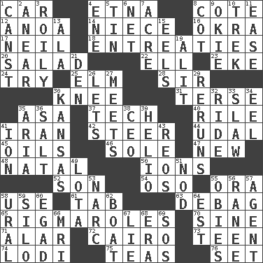 ACROSS 1. Automobile 4. Inactive volcano in Sicily 8. ____ d'Azur (French Riviera) 12. Small Philippine buffalo 14. Sibling's daughter 16. Gumbo ingredient 17. Famous astronaut Armstrong 18. Pleas 20. First course 22. Pipe bend 23. Make supply last 24. Attempt 25. Shade tree 28. Title for a knight 30. Leg joint 31. Laconic 35. White ___ sheet 37. Technician 40. Cause heat under the collar 41. SW Asia republic 42. Guide 44. Allodial 45. Petroleums 46. Not divided or shared with others 47. ___ Haven, CT 48. Relating to or accompanying birth 50. Charged particles 52. Manchild 54. Bear (Spanish) 55. Mouth or opening 58. Purpose 61. Keyboard key 63. Debunk (Brit. slang) 65. Complicated, petty procedures 70. Trig term 71. Having or resembling wings 72. Capital of Egypt 73. Adolescent 74. Farming town in central California 75. Beverages made from leaves 76. Arrange properly for use DOWN 1. 2nd pers. sing. pres. of can (arch.) 2. Approach 3. Turbulent 4. Compass dir. 5. Metal container 6. Remaining after all deductions 7. 43,560 square feet 8. Small bed 9. Migrant worker of the '30s 10. Long journey 11. Relaxation 13. Wing 15. Snakelike fish 19. Came down and settled, as after flight 21. Lair 26. Allows 27. Confronts 29. Summer TV shows 30. Sunflower state 32. Travel on or in a vehicle 33. Cole _ (cabbage dish) 34. Snakelike fish 35. Roberta Peters solo 36. Table seasoning 38. Corporate head (abbr.) 39. Sun: prefix 41. Electrically charged atom 43. Vintage cars 49. Globular water bottle used in Asia 51. Allow head to fall sleepily 53. Drug cop 55. Off-Broadway awards 56. The wife of a rajah (variant) 57. Representative 58. Mountain range 59. Grain storage tower 60. Mild oath 62. Water vessel 64. Eastern Standard Time (abbr.) 66. Medical imaging device (abbr.) 67. Whopper 68. Epoch 69. Distress signal