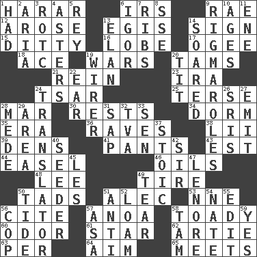 ACROSS 1. Ethiopian city, capital of Harari 6. Big collection agency 9. Actress Charlotte 12. Came up 13. The front part of a cuirass 14. Omen 15. Short, simple song 16. Ear part 17. Double curve, resembling the letter S 18. Adept person 19. Armed conflicts 20. Scottish caps 21. It's straight from the horse's mouth 23. Lyricist Gershwin 24. Russian ruler of old 25. Laconic 28. Spoil 30. Musical pauses 34. Dormintory (informal) 35. Epoch 36. All-night dance parties 38. Cards in a Roman deck? 39. Lairs 41. Leg coverings 43. Eastern Standard Time (abbr.) 44. Artist's stand 46. Petroleums 48. Area sheltered from the wind 49. Hoop that covers a wheel 50. Small amounts or degrees 51. Actor Baldwin 53. Compass dir. 56. Quote 57. Small Philippine buffalo 58. Sycophant 60. Scent 61. Play the lead 62. Nick name for Arthur 63. For each 64. Direct toward a target or goal 65. Confronts DOWN 1. Possessed 2. Roberta Peters solo 3. College mil. group 4. Michaelmas daisies 5. Marina Del _, California 6. Composer Stravinsky 7. Chest bones 8. Compass dir. 9. Complicated, petty procedures 10. Ripens 11. Compass dir. 13. Style 14. Flew 19. One who wires 20. Teat (slang) 22. Hearing organ 24. Interpreter 26. Indian titles of respect 27. Give off 28. Ancient Persian 29. Type of rug 31. Plant excrement 32. Federal power corp. 33. Elected rep. 37. Unemotional 40. Sowing specialist 42. Title for a knight 45. French article 47. Poe poem 49. Rend 50. Periodic rise and fall of the sea level 51. Against 52. Rich soil 54. Nathan's nickname 55. Prepare for publication 56. Police officer (slang) 57. White ___ sheet 58. Scottish cap 59. Consenting reply