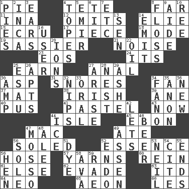 ACROSS 1. Sliced dessert 4. False hair 8. Distant 11. _ tizzy (2 wds.) 12. Leaves out 14. Writer Wiesel 15. Shade of tan 17. Component 18. Method 19. More impudent 21. Annoying sound 23. Greek goddess of the dawn 24. ___ a Wonderful Life 25. Merit 27. Of or related to the anus 30. Viper 31. Sounds asleep 34. Air blower 37. Floor protector 38. From or relating to Ireland 39. A saturated hydrocarbon 40. Fluid product of inflammation 41. Soft color 43. Immediately 44. Small island 45. Inky black, to poets 47. Big _ 49. Had dinner 50. Having a sole or soles 52. Gist 56. Stockings 57. Tall tales 60. It's straight from the horse's mouth 61. Otherwise 62. Dodge 63. It would 64. Modern: prefix 65. Period of immesurable duration 66. French article DOWN 1. Sliced desserts 2. South American Indian 3. Hearing organs 4. Drinks excessively 5. Arab leader 6. Standoff 7. And so on (abbr.) 8. Soft thread for cleaning between teeth 9. Assistant 10. To riddle 13. Elected rep. 14. Give off 16. One who makes use of a thing 20. Charged particles 22. Petroleum 25. He sold his birthright 26. Tenement units (abbr.) 27. Get up 28. A home for chicks 29. American tennis player Robert 30. Electrical Unit 32. Cuts off 33. Relating to the mouth 34. Papal veil 35. At once, immediately (arch.) 36. ___ Haven, CT 42. Allows 44. Frozen water 46. Fermented drink made from hops 47. With motion or animation 48. Toward shelter 49. NE Netherlands city 50. Flatfish 51. Color 52. Inside; within (prefix) 53. Famous astronaut Armstrong 54. Quote 55. Conclusions 56. Layer 58. Actress Gardner 59. Actress Charlotte