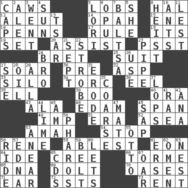 ACROSS 1. Crow sounds 5. Tennis shots 9. Actor Linden 12. Eskimo relative 14. Brightly colored fish 15. Compass dir. 16. Actor Sean's family 17. Court order 18. ___ a Wonderful Life 19. Put into a specified state 20. Help 23. Inconspicuous attention getter 24. Cy Young winner Saberhagen 25. Costume for a special activity 27. Fly high 30. Before (prefix) 32. Cleo's killer 33. Grain storage tower 34. Torque (variant) 36. Snakelike fish 38. Pipe bend 39. Oct. 31 cry 40. Mouth or opening 43. In the manner of 46. Dutch treat 48. Connect, as a bridge 49. Naughty child 51. Epoch 52. Toward the sea 53. Nursemaid 54. Cease 56. French philosopher Descartes 58. Most capable 61. Period of immesurable duration 64. Binary compound 65. Algonquian 66. Singer Mel 68. Heredity factor (abbr.) 69. Stupid person 70. Fertile tracts in a desert 71. Hearing organ 72. Fast planes 73. Monthly bill DOWN 1. Smile enhancers 2. Toward shelter 3. Left 4. Player for Phoenix 5. Australian parrot (variant) 6. Musical composition 7. Greek mezzo-soprano Agnes 8. A female animal or person 9. Robbery 10. Pismires 11. For fear that 13. Russian ruler of old 21. Back-to-school mo. 22. Disco prop 23. Corncob 24. Sis' sibling 26. Purpose 27. Compass dir. 28. Petroleum 29. Silent film actress Nazimova 31. Wear away 35. Rough 37. Chops off 41. Actress Charlotte 42. Santa ___, CA 44. Citrus frut 45. Wet nurse (var.) 47. Floor protectors 48. Plant excrement 50. N Egypt peninsula 53. Approach 55. "Beetle Bailey" pooch 56. Travel on or in a vehicle 57. Pulitzer Prize-winning author Ferber 59. Waist strap 60. Allows 61. Celtic language 62. Presage 63. Egg locale 65. Music discs 67. Rowing implement