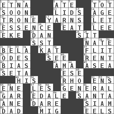 ACROSS 1. Inactive volcano in Sicily 5. Had dinner 8. Small child 11. Within a short period 12. Flaplike coverings 14. Mature 15. Marketplace scale 17. Entertaining tales 18. Allow 19. Substance 21. Consume 22. Area sheltered from the wind 23. Make supply last 24. One of the 12 tribes of Israel 25. Be seated 27. Fast jet (abbr.) 28. Nathan's nickname 31. Actor Lugosi 35. Krazy ___ of comics 37. Sudden quick movement 38. Lyric poems 39. Perceive with the eye 41. Monthly bill 42. Prejudice 43. Nanny (var.) 45. At sea 46. Bristle 47. Compass dir. 49. Part of HMS, perhaps 51. 17th letter of the Greek alphabet 52. Followers of ems 55. Compass dir. 57. French article 60. Commissioned military rank 62. Slender fish 63. Peak District village in England 65. Before Barbara or Clara 66. A saturated hydrocarbon 67. Have the gumption 68. Thailand, formerly 69. Male parent 70. Russian fighter aircraft 71. Snakelike fish DOWN 1. First name in cosmetics 2. Cod relative 3. Trap for birds or small mammals 4. Queen of England 1702-14 5. Chicken ___ king 6. Hoop that covers a wheel 7. Pulitzer Prize-winning author Ferber 8. Baron Munchausen's specialties 9. Double curve, resembling the letter S 10. False hair 13. Fast planes 16. Extremities 17. Gossips 20. Keg 26. Kind of red light 29. Prong on a fork 30. Singer James 31. Moves up and down 32. Singer Brickell 33. Resembling or made to resemble leather 34. Slender Brazilian palm 36. Afternoon social gathering 40. Develop 44. American tennis player Robert 48. Immeasurably long periods of time 50. Downhill vehicle 52. Bert's buddy 53. Relating to or accompanying birth 54. Shuts with force 55. Mild oath 56. Grandmother 58. Dutch treat 59. Indian skirt 61. Comfort 64. Part of a journey