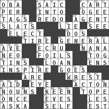 ACROSS 1. Chief or king in Benin or Nigeria 4. Ketch in the Levant 8. Draw slowly or heavily 12. For each 13. To the inside or interior of 14. Double curve, resembling the letter S 15. Labels 17. Do over again 18. Representative 19. Narrow boards 21. Whopper 23. Perceive with the eye 24. Choose 26. Two (Sp.) 28. Become fatigued 30. Commissioned military rank 34. "___ Maria" 37. Shade of tan 39. Grandmother 40. Modern: prefix 41. Fencing necessities 43. Coat; cloak 44. Metal containers 46. Grant temporary use of 47. Followers of ems 48. Heighten or intensify 51. Leaves 54. "We ___ not amused" (Victoria) 55. Obtain by seizing forcibly or violently 58. Assist 61. Sight organ 63. NE Massachussets city 65. Parts of speech 67. Peachy ____! 71. Drink excessively 72. At one time in the past 73. Nights before holidays 74. French article 75. "____ silly question..." 76. Itself 77. Eastern Standard Time (abbr.) DOWN 1. Elects 2. Memphis, Tenn. Street 3. Therefore, facetiously 4. Title for a knight 5. A saturated hydrocarbon 6. It would 7. Calm and collected 8. Gear tooth 9. Matures 10. French philosopher Descartes 11. Wig 16. Proofreading order 18. A really long time 20. _-fi 22. Binary compound 25. Not kosher 27. Elected rep. 29. Learning spot: Fr. 30. Russian prison camp 31. Pace 32. Soon (poet.) 33. Fails to keep up a pace 34. Against 35. Distinctive style or manner 36. Immeasurably long periods of time 38. _ de Janeiro 42. Overwhelm 45. Health resort 49. Angers 50. Marina Del _, California 52. Period 53. Religious group 56. Took without asking 57. Drinks excessively 58. Small Philippine buffalo 59. Charged particles 60. Evade 62. Supplements with great effort 64. A home for chicks 66. Teachers' org. 68. First lady 69. Snakelike fish 70. Overdraft (abbr.)