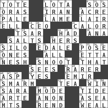 ACROSS 1. Haul 5. Globular water bottle used in Asia 9. Mayday 12. Mouths or openings 13. SW Asia republic 14. Measure of real estate 15. Diluted with white 16. Unable to walk 17. Den 18. Pipe bend 19. Corporate head (abbr.) 21. Bodily heat indicating an inflammation 22. Russian ruler of old 24. Possessed 26. Santa ___, CA 27. Table seasonings 28. Possessive pronoun 29. Grain storage tower 30. Peak District village in England 32. Introduce or present, as a question 36. Singles 37. 100% 38. Singer James 39. Soft 40. Snout, nose 42. Not this but _ 43. Observes 44. More valued for its uncommonness 46. Viper 49. Affirmative reply 50. Independent ruler or chieftain 51. Excessive but superficial compliments 53. Afternoon social gathering 54. Acquire through effort 57. "Two Mules for Sister ____" 58. Method 61. Event that recurs at intervals 62. Johnson of "Laugh-In" 63. Soon (poet.) 64. At sea 65. Mountains (abbr.) 66. Tear apart 67. Welt DOWN 1. Drink excessively 2. Taken by mouth 3. Baron Munchausen's specialties 4. Compass dir. 5. _ and Stitch 6. Mouth or opening 7. Scottish cap 8. One (Scot) 9. Any of the three canals of the cochlea 10. Greek mythologigal hunter 11. Father Junipero _ 14. Insect wing 19. Feline 20. Celtic language 21. Music discs 23. Splash clumsily 24. Phone greeting 25. "We ___ not amused" (Victoria) 27. Trig term 28. Rings 29. Manchild 31. Natives or inhabitants of Denmark 32. _ dish (used to culture cells) 33. Else 34. Play the lead 35. Ingest 40. Perceive with the eye 41. Family _ (genealogy) 43. Symbol (abbr.) 45. Nanny (var.) 46. Indian state 47. Don Adams' spy role 48. Actors' quests 52. Actress Charlotte 53. Be inclined (to) 55. It may be bright or harebrained 56. Be tempered by heat 58. Make imperfect 59. Single 60. Spanish title 61. The 23rd letter of the Hebrew alphabet