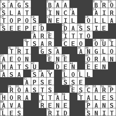 ACROSS 1. Settles 5. Sound made by sheep 8. Sis' sibling 11. Narrow board 12. South American Indian 14. Atmosphere 15. Traditional theme or motif 17. Famous astronaut Armstrong 18. Rounded earthenware pot or jar 19. Oozed 21. Hyrax 23. "We ___ not amused" (Victoria) 25. "Tell ____ the Marines!" 26. Russian ruler of old 27. Corporate head (abbr.) 28. Fr. "Yes" 31. Three (prefix) 33. Girls' org. (abbr.) 35. White American of non-Hispanic descent 37. A really long time 38. Compass dir. 40. Northwest Algerian city 41. Taiwanese island in East China Sea 43. Lair 45. Car or cant ending 46. White ___ sheet 47. Declare 50. Hang loosely or laxly 52. Domed church section 53. Compass dir. 54. Ridicules or criticizes harshly 56. Fortification 61. Israeli folk dance 62. Slanted text style (abbr.) 65. Falsehoods 66. Actress Gardner 67. French philosopher Descartes 68. Baking dishes 69. French article 70. To free from 71. In a ____ (agitated or irritated) DOWN 1. Fast planes 2. _ vera 3. Stare wonderingly 4. Close up, plug up 5. Storage container 6. A saturated hydrocarbon 7. Being or containing an acid 8. Indonesian resort city 9. Cause heat under the collar 10. Mouth or opening 13. Having winglike extensions 16. Oceans 18. Bear (Spanish) 20. To trail on the ground 22. Portico 24. Celtic language 26. Metal containers 28. Legendary monster 29. ____ Bator, Mongolia 30. Electrically charged atom 31. Afternoon social gatherings 32. Round or rotation of duties 34. Added to 36. Christmas carol 37. Nanny (var.) 39. Snakelike fish 42. United States Postal Service (abbr.) 44. Sense of smell 48. Moving about 49. Last 51. For fear that 52. Auto club (abbr.) 54. Be footloose 55. Mouths or openings 57. Smile enhancers 58. Actor Alda or Thicke 59. Painter Guido (1575-1642) 60. Inconspicuous attention getter 61. Actor Linden 63. Black tropical American cuckoo 64. Directed
