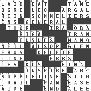 ACROSS 1. Put down 5. Consume 8. Docile 12. Legendary monster 13. Lion 14. Therefore, facetiously 15. It's straight from the horse's mouth 16. Wine waiters 19. Followers of ems 20. Commissioned military rank 21. Son of Odin 23. Lyricist Gershwin 24. Chief or king in Benin or Nigeria 27. Port city in Latvia 30. SW Asia republic 31. Follows as a consequence or result 34. Billionth: prefix 35. Famous astronaut Armstrong 38. Columnist Joseph or Stewart 40. Small, secluded valley 41. Greek god of love 42. Keyboard key 44. Actor's bit 45. Blunders 46. French article 47. Two (Sp.) 50. Inactive volcano in Sicily 53. Heighten or intensify 57. Curve 59. Supplying deficiencies 63. Agitate 64. Lag or linger behind 65. Baking dish 66. Relaxation 67. Helper 68. Conclusion 69. Toward shelter DOWN 1. Old wives' tales, e.g. 2. Rep 3. From or relating to Ireland 4. Lair 5. Otherwise 6. A really long time 7. Heavy book 8. Three (prefix) 9. Grow older 10. Impair 11. Raised railways 14. Silent film actress Nazimova 17. Medical imaging device (abbr.) 18. Ewer handle 20. Amused look 22. Threatening words 24. Spoken 25. Object of repulsion 26. At once, immediately (arch.) 28. Girls' org. (abbr.) 29. Old (Scot.) 30. Eat 32. Compass dir. 33. Not divided or shared with others 35. 1994 drama film starring Jodie Foster 36. One of the Great Lakes 37. Charged atoms 39. For each 43. Woody plant 47. Deli pickle 48. Single 49. Fast jet (abbr.) 51. Relating to or accompanying birth 52. Ascend 54. Corncob 55. "Terrible" tsar 56. Tear apart 58. Algonquian 59. R.R. building 60. RI univ. 61. Writing tablet 62. Sliced dessert 63. Ocean