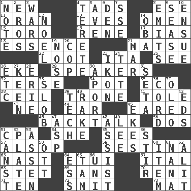 ACROSS 1. ___ Haven, CT 4. Bits 8. Compass dir. 11. Northwest Algerian city 13. Nights before holidays 14. Sign of something about to happen 15. "Corrida" creature 16. French philosopher Descartes 17. Prejudice 18. Substance 21. Taiwanese island in East China Sea 22. Spoils 23. Call ___ day 25. Perceive with the eye 26. Make supply last 29. Orators 32. Laconic 34. Plant holder 35. Environmental prefix 38. To provide with a ceiling 39. Heavy duty weighing machine 41. Lacquered or enameled metalware 43. Modern: prefix 44. Ewer handle 45. Having ears or earlike features 46. Sass 50. Two (Sp.) 51. Tax preparer (abbr.) 54. A female animal or person 55. Perceives with the eye 57. Columnist Joseph or Stewart 59. French poetic form 63. Political cartoonist Thomas 64. Needle holder 67. Slanted text style (abbr.) 68. Proofreading order 69. Without 70. Painter Guido (1575-1642) 71. "___ Little Indians" 72. Stricken, poetically 73. Floor covering DOWN 1. Make mention of 2. Greek god of love 3. Armed conflicts 4. Cigar-shaped 5. "___ Maria" 6. Lair 7. Compass dir. 8. Gives off 9. Gospel singer Marvin 10. Take place subsequently 12. Christmas carol 14. Chief or king in Benin or Nigeria 19. Olfactory organ 20. Police officer (slang) 21. Impair 23. Image 24. False hair 26. And so on (abbr.) 27. Peachy ____! 28. One of the Great Lakes 30. To the left, to Queeg 31. Bristle 33. Oscar Madison type 36. Drawstring 37. Butter sub 39. Georgia ____ (Atlanta school) 40. Libertine 42. Begley and Asner 45. Makes supply last 47. Cleo's killer 48. Aid 49. Area sheltered from the wind 51. 2nd pers. sing. pres. of can (arch.) 52. Food holder 53. NE Netherlands city 56. Disorderly outburst 58. Baseball player Mel 60. A distinct part 61. Grandmother 62. Came down and settled, as after flight 64. Double-curved letter 65. Scottish cap 66. University (slang)