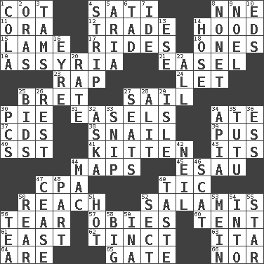 ACROSS 1. Small bed 4. Suttee (variant) 8. Compass dir. 11. Mouth or opening 12. Swap 14. Parka part 15. Unable to walk 17. Amusement-park features 18. Singles 19. Nineveh was its capital 21. Artist's stand 23. Strike 24. Allow 25. Cy Young winner Saberhagen 27. Move on water 30. Sliced dessert 31. Artist's stands 34. Had dinner 37. Music discs 38. Slow-paced one 39. Product of festering 40. Fast jet (abbr.) 41. Baby cat 43. It is 44. Atlas contents 45. Son of Isaac 47. Tax preparer (abbr.) 49. Nervous spasm 50. Arrive at 52. Deli grouping 56. Pull apart 57. Off-Broadway awards 60. Portable shelter 61. 90 degrees 62. Tinged 63. Call ___ day 64. "We ___ not amused" (Victoria) 65. Yard entry 66. And not DOWN 1. Root beer relative 2. Mouths or openings 3. Scottish caps 4. Remove all contents or possession from 5. Operatic vocal solo 6. Small amount or degree 7. Binary compound 8. Music written for nine 9. Christmas carol 10. Begley and Asner 13. Compass dir. 14. Flexible conduit 16. Jane of fiction 20. Pace 22. Everything 25. Auction offers 26. Take ten 27. Theater features 28. Set down 29. Capri or Wight 30. Personal Computers (abbr.) 32. "____ silly question..." 33. Clip 34. Capital of Western Samoa 35. Ballerina skirt 36. Double-curved letter 42. Famous astronaut Armstrong 44. Apple computer (short form) 46. Jazz singing style 47. Stop 48. Piece 49. Clothes sense 50. Stern 51. Being at a high temperature 52. Religious group 53. Chow _ 54. To the inside or interior of 55. Play the lead 56. Afternoon social gathering 58. Of large size 59. _ tizzy (2 wds.)
