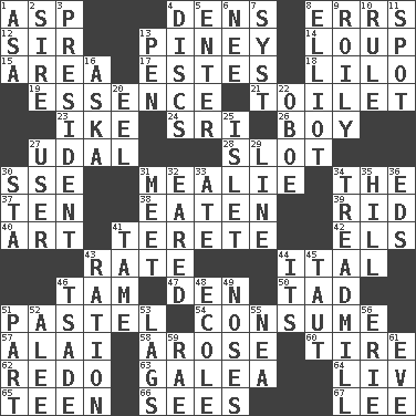 ACROSS 1. Viper 4. Habitations of wild animals 8. Blunders 12. Title for a knight 13. Abounding in pines 14. Central Nebraska county 15. Type of rug 17. _____ Park, CO 18. _ and Stitch 19. Substance 21. Bathroom plumbing fixture 23. Eisenhower's nickname 24. Indian title of respect (Mr.) 26. Male child 27. Freehold land 28. Notch 30. Compass dir. 31. Ear of corn 34. Definite Article 37. "___ Little Indians" 38. Eroded 39. To free from 40. Nonscientific branch of learning 41. Cylindrical with tapered ends 42. Raised railways 43. Assign a rank or rating to 44. Slanted text style (abbr.) 46. Scottish cap 47. Lair 50. Small amount or degree 51. Soft color 54. Ingest 57. Jai ____ 58. Came up 60. Become fatigued 62. Redecorate 63. An organ shaped like a helmet 64. 54 in ancient Rome 65. Adolescent 66. Observes 67. Area sheltered from the wind DOWN 1. White ___ sheet 2. Male parent of an animal 3. Elected leader of a country 4. Plates 5. Keyboard key 6. Born 7. System (abbr.) 8. American author Paul (1891-1958) 9. Turbulent 10. Governing power 11. Specific locale 13. Animal enclosure 16. "____ silly question..." 20. Snakelike fish 22. Mitch Miller's instrument 25. Small island 27. One who makes use of a thing 29. Actor's bit 30. R.R. building 31. Confront 32. Having ears or earlike features 33. Had dinner 34. Excercise machine 35. Land elevation 36. Begley and Asner 41. Docile 43. Food allowance for one day 44. It is 45. Tense 46. Sadhe (variant) 48. Learning spot: Fr. 49. Olfactory organs 51. Piece 52. Toward shelter 53. Fails to keep up a pace 55. Teachers' org. 56. One of the Great Lakes 59. Actress Charlotte 61. First lady